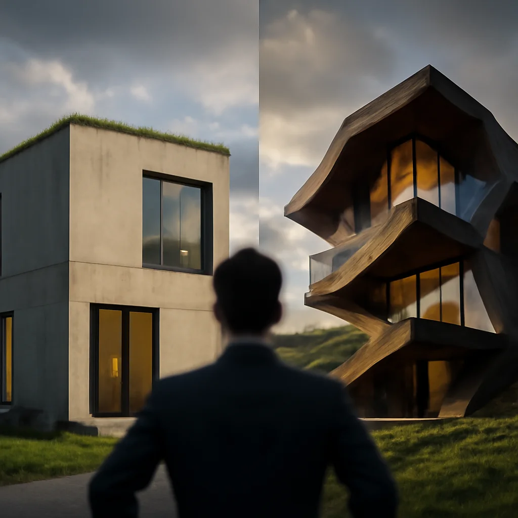 O casă cu formă complexă are elemente arhitecturale inedite și spații neconvenționale, oferind un potențial estetic mai mare. Construcția este mai costisitoare și necesită o planificare atentă.