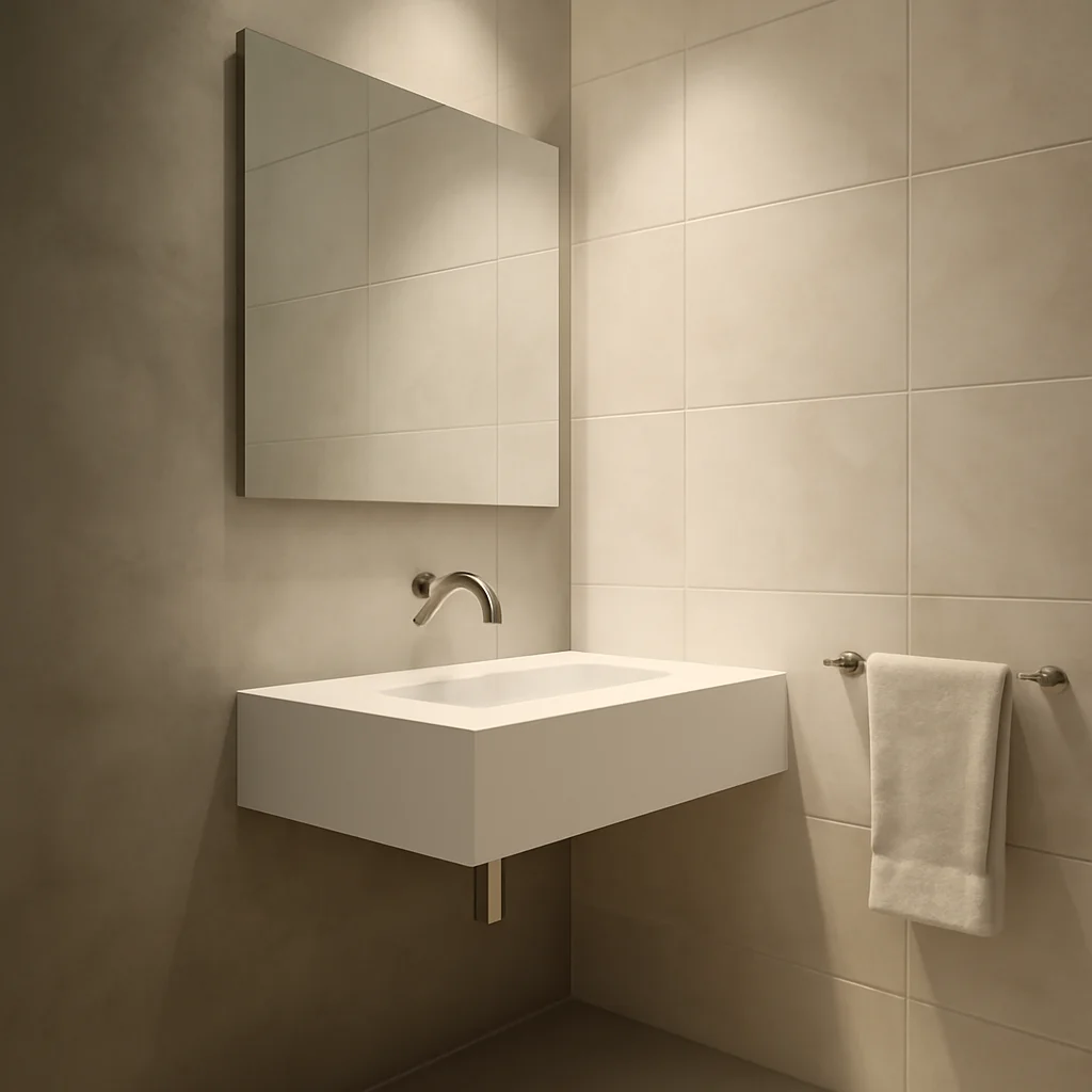 Microcimentul, un amestec fin de ciment, nisip, polimeri și pigmenți, este tot mai utilizat în finisajele interioare, inclusiv în băi, datorită aspectului său modern și a posibilității de a crea suprafețe continue, fără rosturi. Aplicat în straturi subțiri (de obicei între 2 și 3 mm), microcimentul aderă la o varietate de suprafețe, precum gresie existentă, beton, ceramică sau chiar lemn, reducând astfel necesitatea unor lucrări de demolare costisitoare. Standardul relevant pentru microciment este SR EN 13813, deși acesta se referă mai mult la șapă, dar principiile de aderență și rezistență sunt aplicabile.