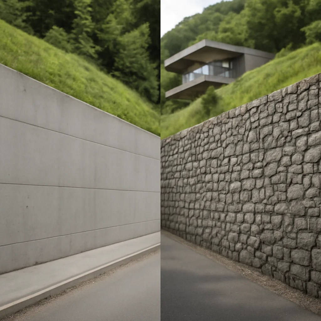 Zidurile din beton oferă soliditate și durabilitate ridicate, fiind o soluție clasică. Cele din gabioane sunt mai flexibile și permit o mai bună integrare în peisaj, fiind coșuri umplute cu pietre.