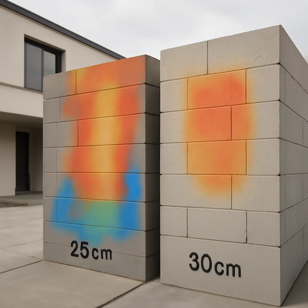 Zidul de 30 cm poate reduce costurile cu izolația termică suplimentară, dar poate fi mai scump inițial din cauza materialului. Zidul de 25 cm este mai ieftin la început, dar costurile pot crește din cauza necesității unui strat de izolație mai consistent.