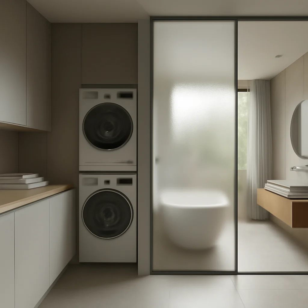 O spălătorie separată reduce umiditatea în alte zone ale casei și permite o ventilație mai bună, prevenind mucegaiul și mirosurile. De asemenea, oferă un spațiu dedicat pentru spălat și depozitare, fără a afecta funcționalitatea băii.