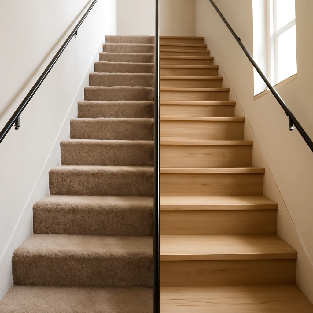 5. Care sunt principalele aspecte de luat în considerare când aleg între mocheta și lemnul la vedere pentru scară?
