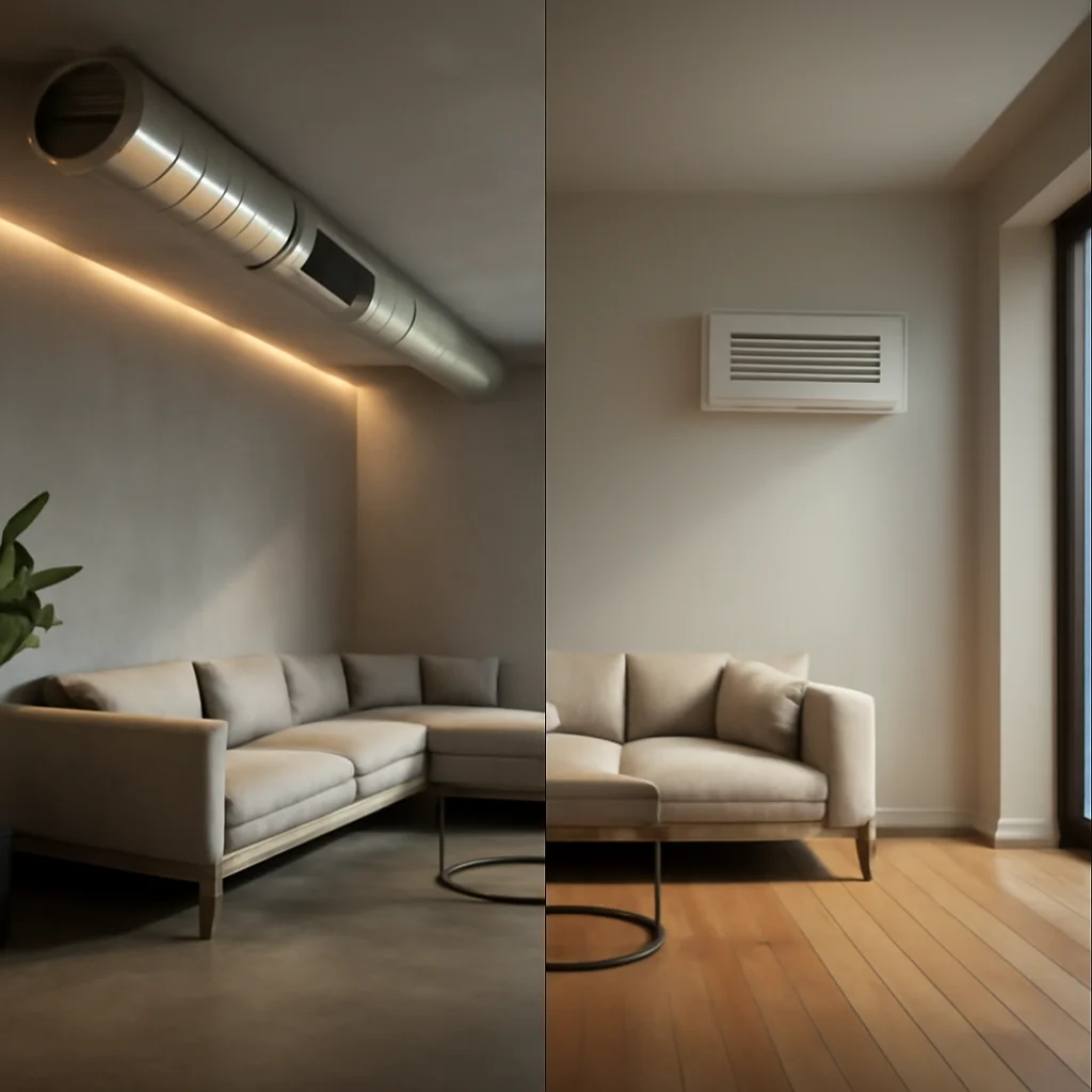 Ventilația cu conducte (centralizată) distribuie aerul prin canale în toată clădirea, în timp ce cea fără conducte (punctuală) ventilează doar încăperi individuale. Sistemul cu conducte este mai complex și necesită o unitate centrală de tratare a aerului, pe când cel punctual utilizează ventilatoare locale.