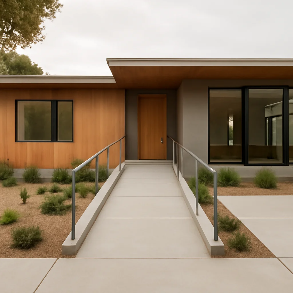 Accesul la o locuință începe încă de la exterior, cu amenajarea terenului și a căilor de acces. Conform normelor SR EN 12184:2022, panta maximă admisă pentru o rampă de acces este de 1:12 (8.33%), cu o lungime maximă de 9 metri între platforme de odihnă. Platformele de odihnă trebuie să aibă o dimensiune minimă de 1.5m x 1.5m pentru a permite manevrarea scaunelor rulante. Este esențială prezența unui balustrad pe ambele părți ale rampei, la înălțimi de 80cm și 90cm, pentru a asigura siguranța utilizatorilor.