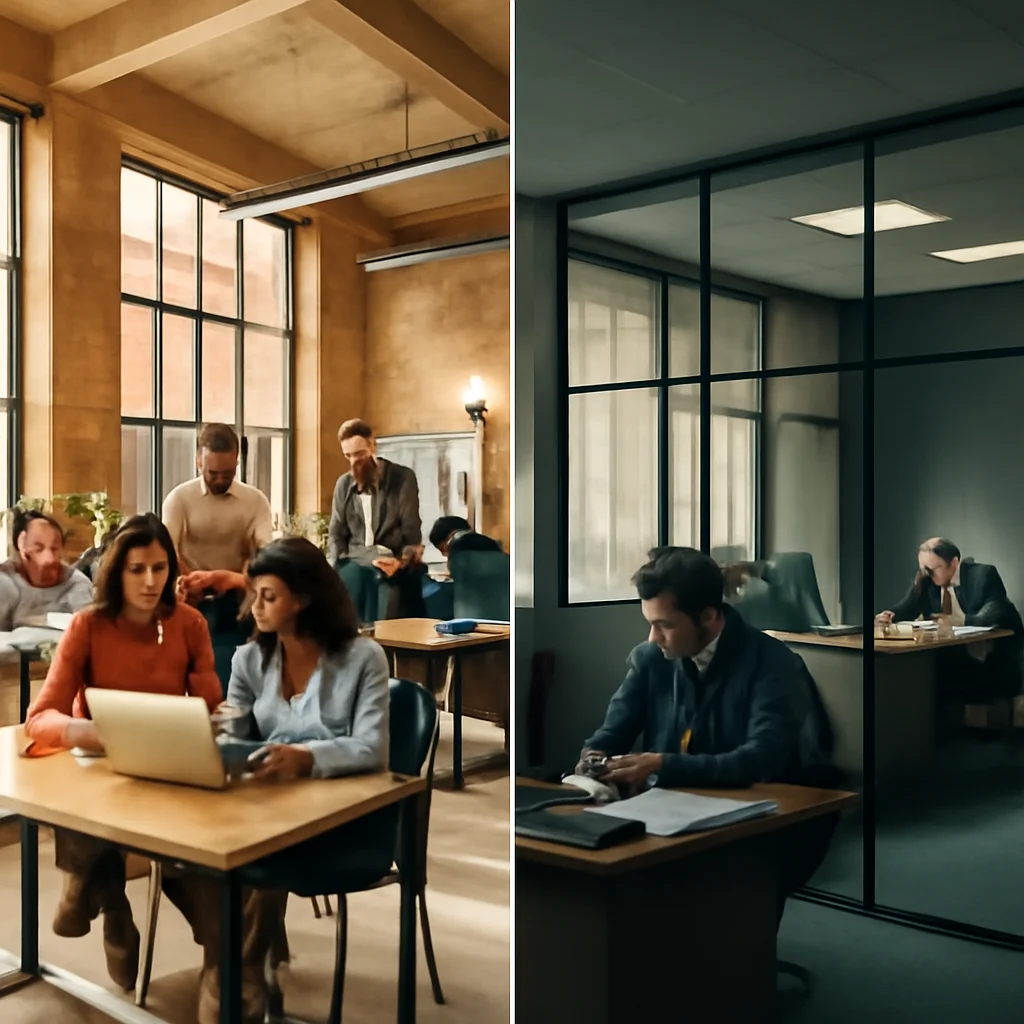 Evoluția spațiilor de lucru a fost influențată de schimbări sociale, tehnologice și economice. Inițial, compartimentarea clasică domina, oferind intimitate și control asupra mediului individual. Ulterior, odată cu dezvoltarea tehnologiilor de comunicație și promovarea colaborării, open-space-urile au câștigat popularitate, fiind percepute ca soluții moderne și eficiente. Cu toate acestea, experiența a demonstrat că niciuna dintre aceste abordări nu este universal valabilă, iar alegerea ideală depinde de contextul specific. Astăzi, tendința este spre o abordare hibridă, care combină elemente din ambele tipuri de spații, pentru a maximiza beneficiile și a minimiza dezavantajele.