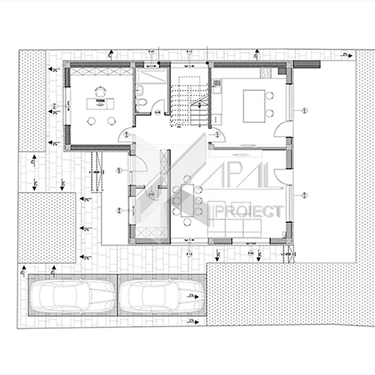 Privat (spre curte): bucătărie închisă 18,67 mp și living 32,15 mp, ambele cu ieșire pe terasă 39,20 mp.