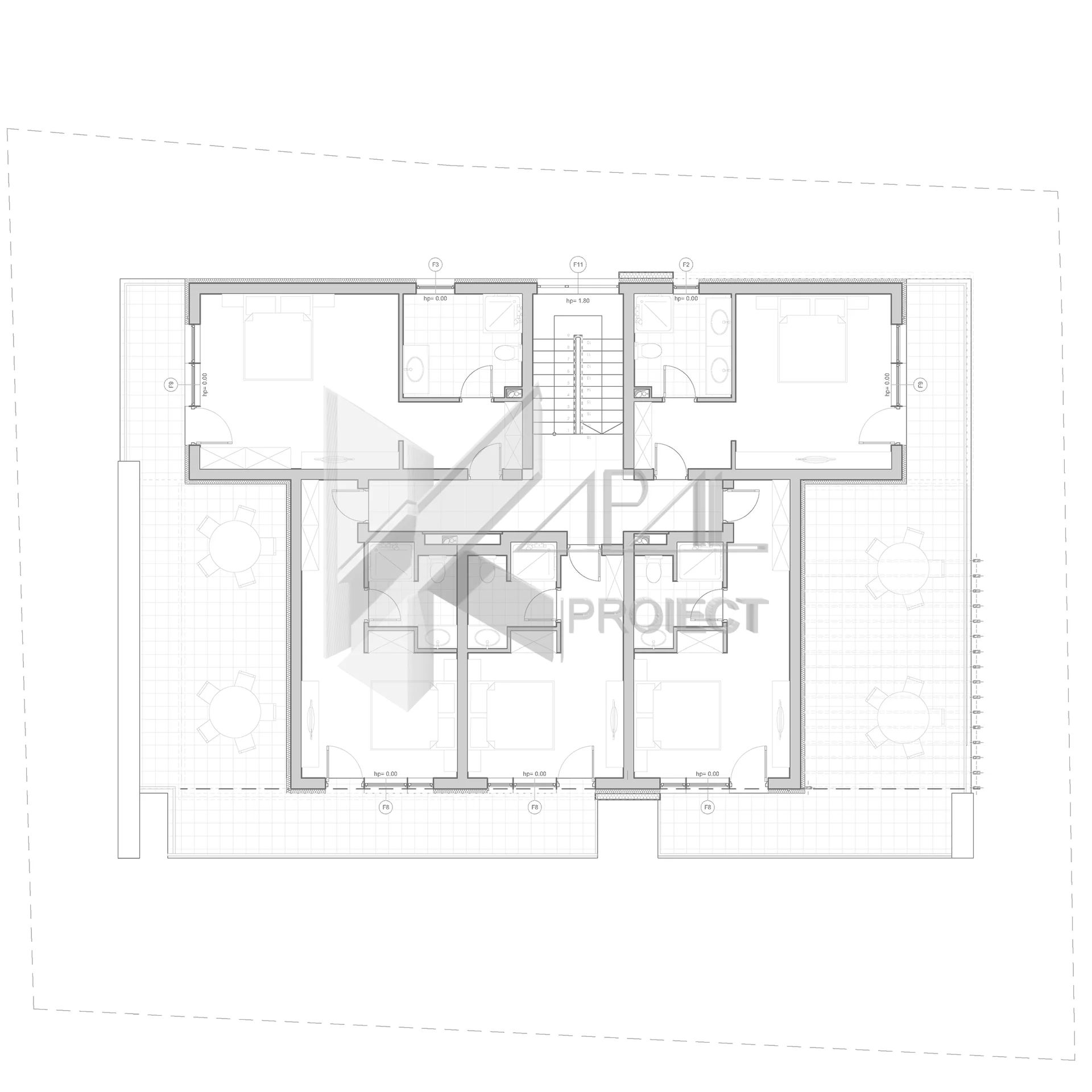 Hol cu nod vertical (scară) + 4 terase perimetral distribuite.