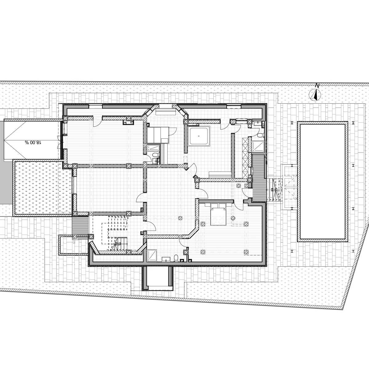 Piscină exterioară la nivelul solului, amplasată pentru intimitate și însorire optimă