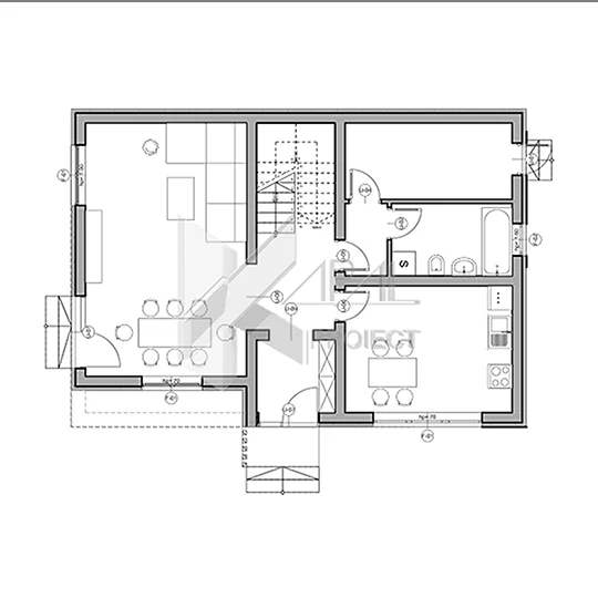 Zona de zi este amplasată la parter și include spații bine delimitate pentru gătit, relaxare și socializare, precum și funcțiuni auxiliare care susțin buna funcționare a locuinței. Livingul beneficiază de acces direct către curte, favorizând extinderea activităților zilnice în exterior și o relație firească între interior și grădină.
