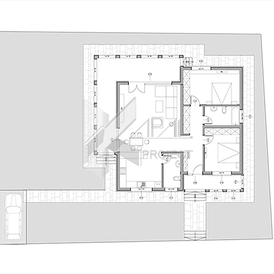 Volumetria compactă (13,75 × 12,55 m) optimizează circulațiile și reduce suprafețele neutilizate, oferind 98,68 mp utili într-o distribuție clară zi–noapte. Livingul de 34,70 mp comunică fluid cu bucătăria deschisă de 12,72 mp, iar deschiderea către terasa de 29,35 mp transformă zona de zi într-un spațiu extins pentru familie și prieteni, protejat de pridvorul cu arcade.