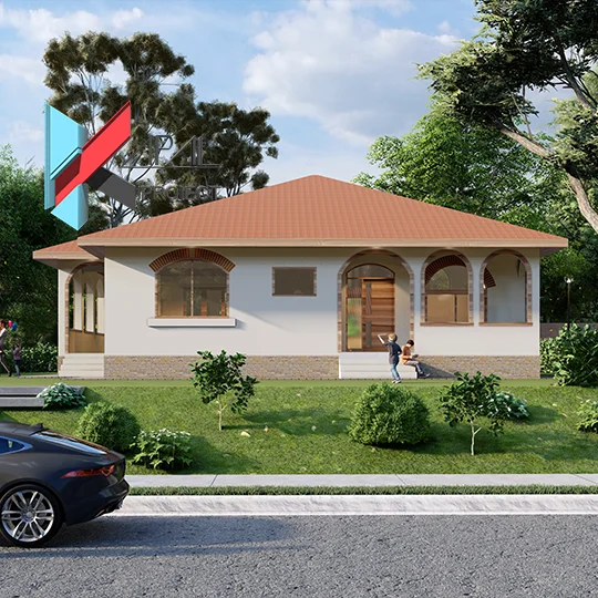 K014 propune o casă parter simplă și grațioasă, în care spiritul neoromânesc este reinterpretat contemporan: proporții echilibrate, pridvoare cu arce care protejează zonele de acces și terasa, plus un joc discret al ancadramentelor din lemn maro pe un fundal crem.