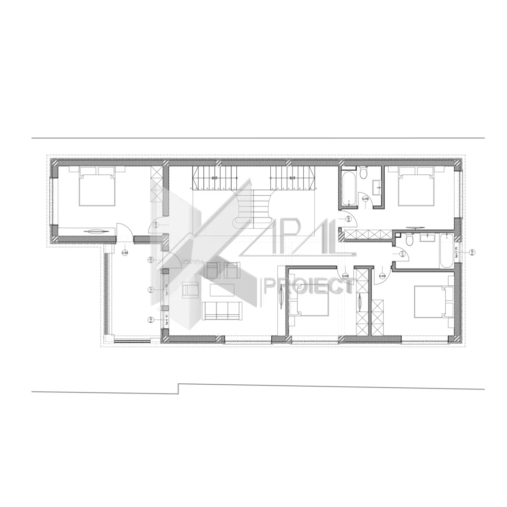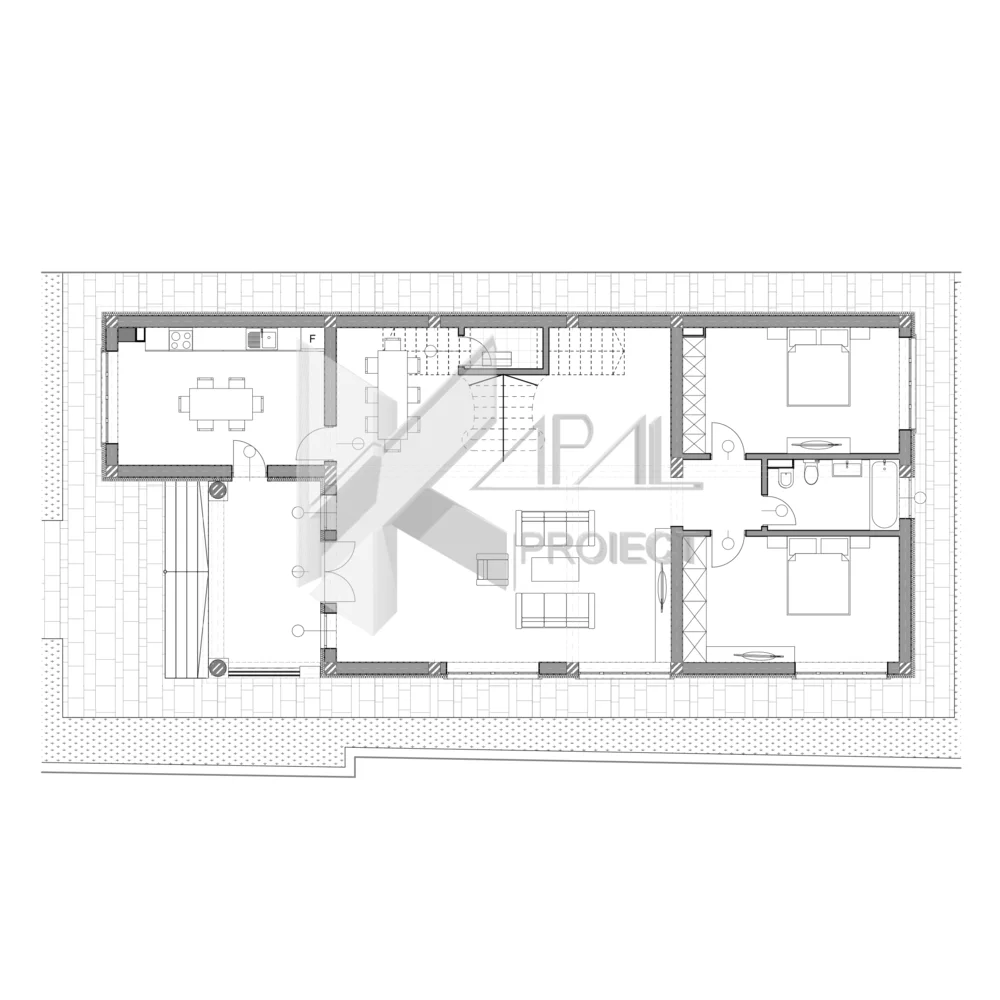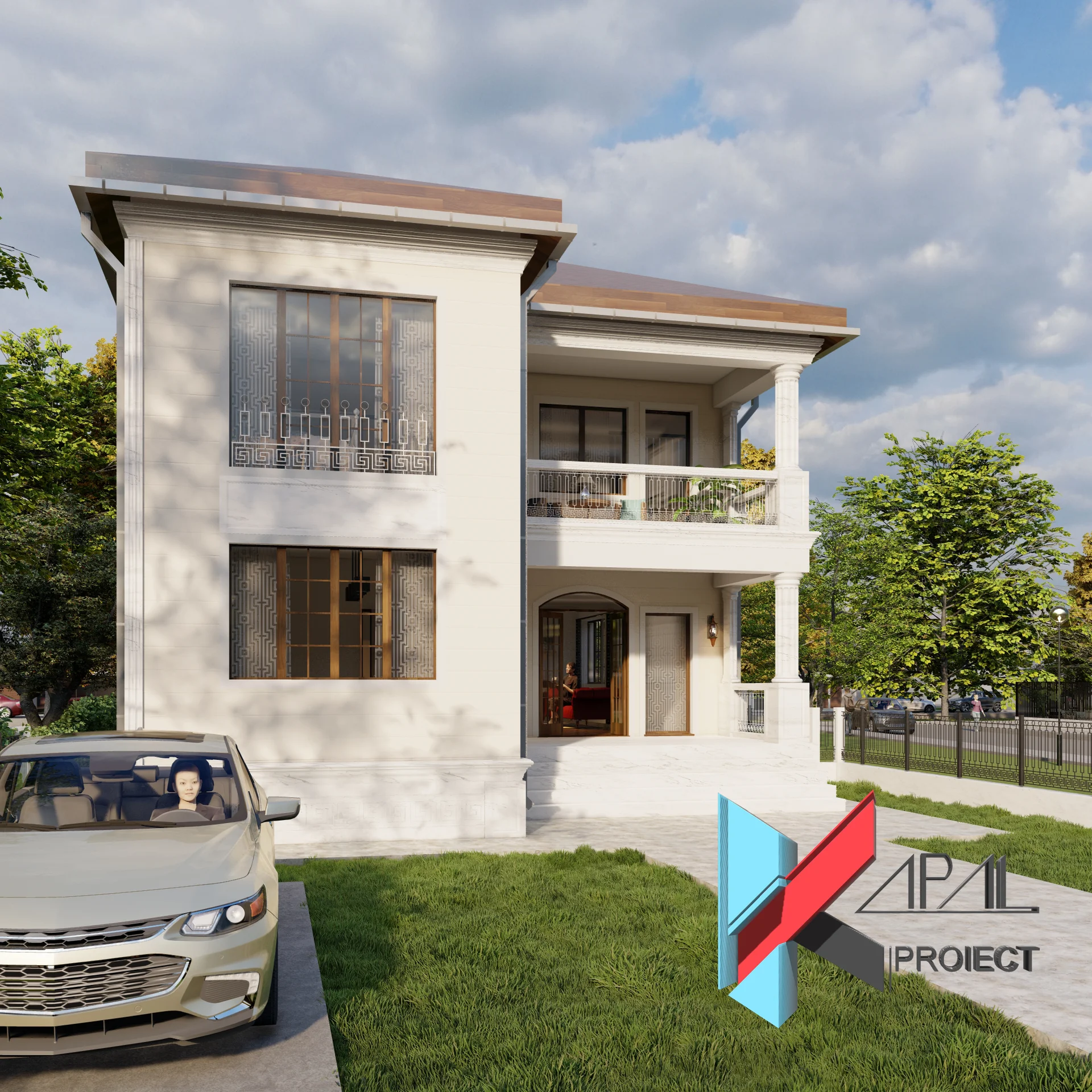 Proiectul K070 propune o casă clasică P+1E cu o compoziție echilibrată pe trei registre – soclu, etaj și cornișă – subliniate prin profile decorative. Accesul principal este marcat de terasa de primire și balconul etajului, susținute vizual de coloane dorice și baluștri din beton, iar glisarea volumului conferă ansamblului o notă monumentală. Ancadramentele ferestrelor și tâmplăria divizată adaugă ritm și eleganță fațadelor. Încăperile sunt orientate cardinal și gândite pentru aport de lumină naturală pe parcursul zilei, prin poziționarea strategică a golurilor vitrate, ceea ce crește gradul de confort și reduce nevoia de iluminat artificial. Fațadele sunt finisate cu tencuială decorativă crem, completată de profile albe din polistiren extrudat pentru detalii clasice curate. Tâmplăria maro accentuează ritmul golurilor și conferă contrast elegant volumetriei. Acoperișul de tip șarpantă este învelit cu țiglă ceramică maro, potrivită limbajului clasic propus.