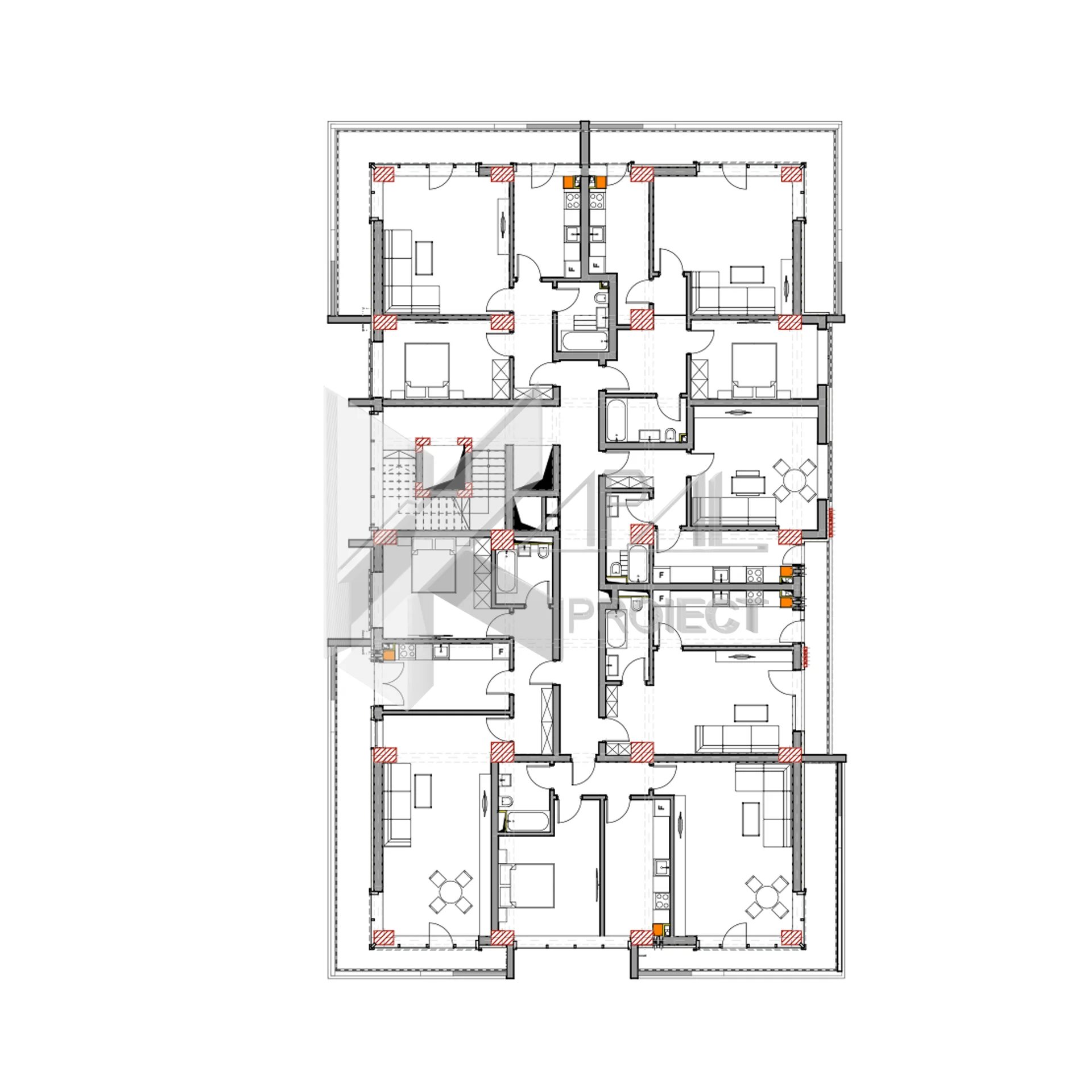 Nod vertical de circulație + două lifturi; hol etaj; 5 apartamente/etaj:
