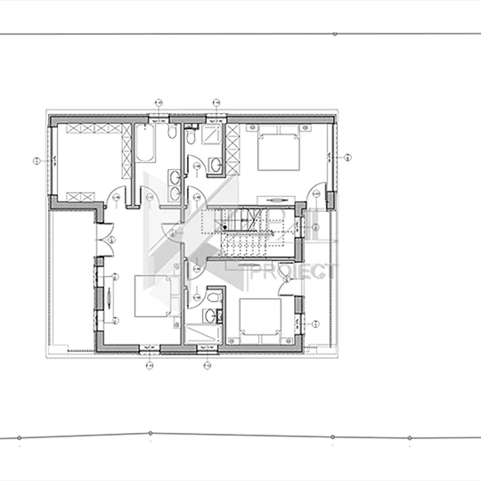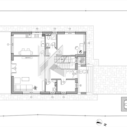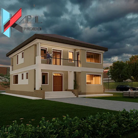 K020 este o locuință clasică reinterpretată în registru contemporan, gândită pentru familii care apreciază eleganța atemporală și funcționalitatea clară. Compoziția volumetrică este echilibrată, iar detaliile discrete — soclu din piatră, marcarea registrului inferior, cornișă profilată, portal de intrare cu stâlpi și ancadramente la ferestre — conferă casei prestanță fără a încărca fațadele.