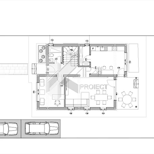 Living cu zonă de luat masa – 23,99 mp, deschidere către terasa acoperită (10,83 mp) și curtea din spate