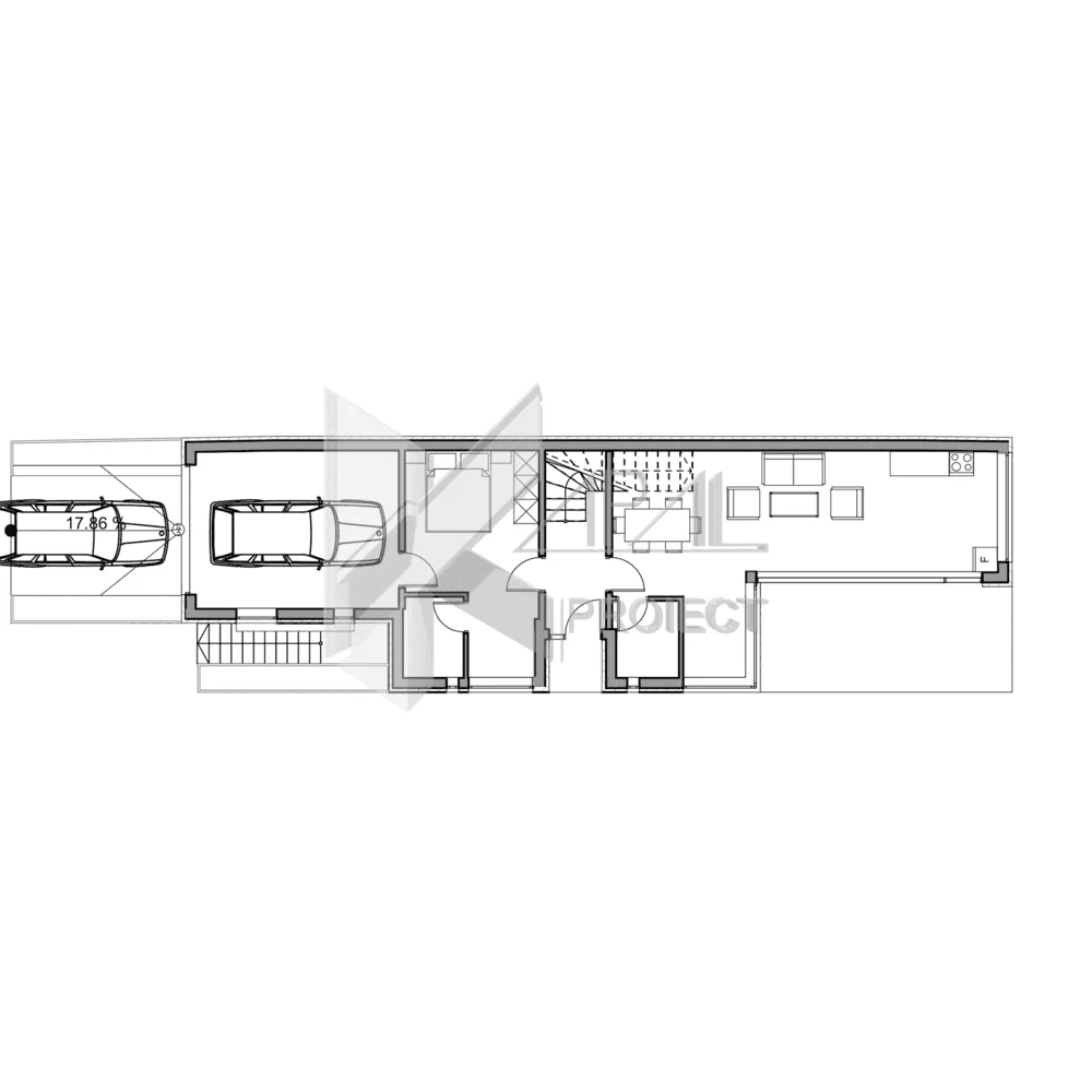 Plan Parter: Hol – 4,33 mp, Nod vertical de circulație, Living + Bucătărie – 33,49 mp (spațiu deschis, luminat natural), Baie – 3,01 mp, Dormitor – 14,98 mp cu baie proprie – 2,97 mp (posibil birou/oaspeti), Garaj – 19,45 mp (acces facil din zona de intrare), Terasă – 22,72 mp (legătură directă cu zona de zi)