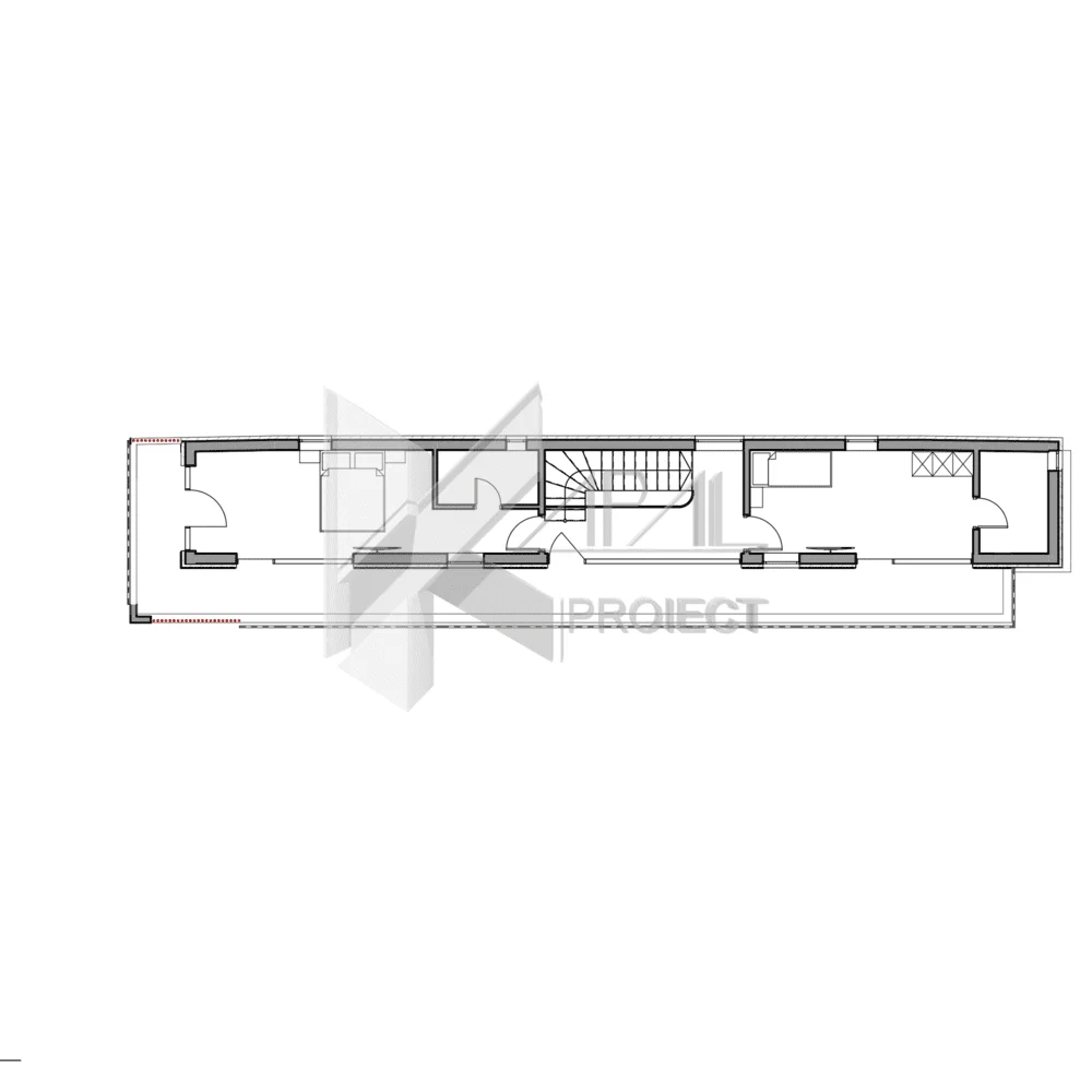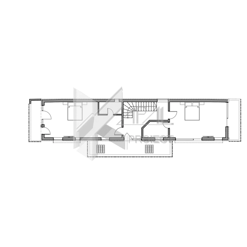 Plan Etaj 2: Hol – 7,66 mp; Nod vertical de circulație; Dormitor – 13,96 mp cu baie – 4,26 mp; Dormitor – 17,70 mp cu baie – 3,35 mp și terasă – 29,04 mp