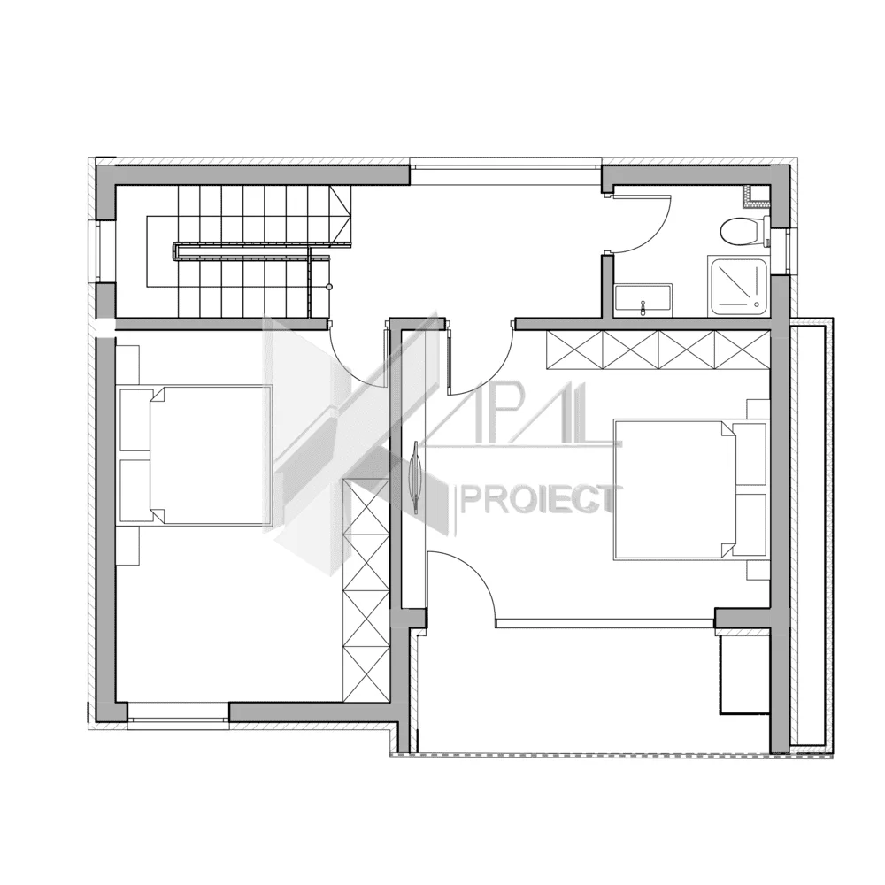 Plan Etaj 1: hol: 5,94 mp, distribuție eficientă către camere, dormitor 1: 16,63 mp, proporții generoase pentru pat matrimonial și dressing, dormitor 2: 16,80 mp, acces la balconul de 5,40 mp, baie: 3,29 mp, deservind ambele dormitoare.