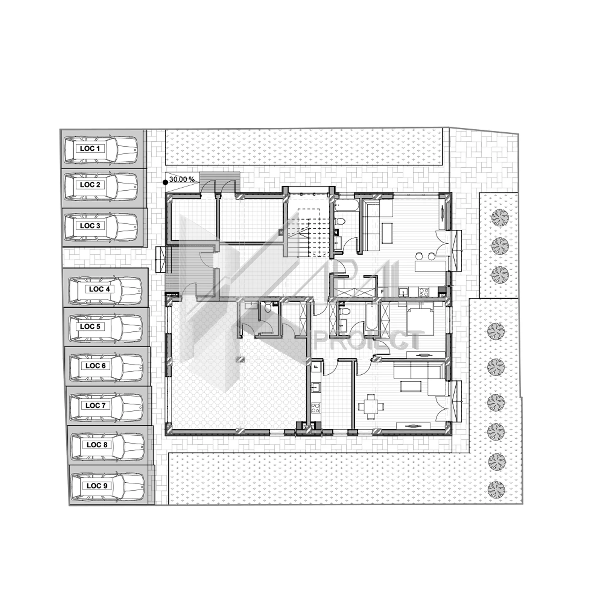 Total băi parter: 3 (două în apartamente + una pentru spațiul comercial)