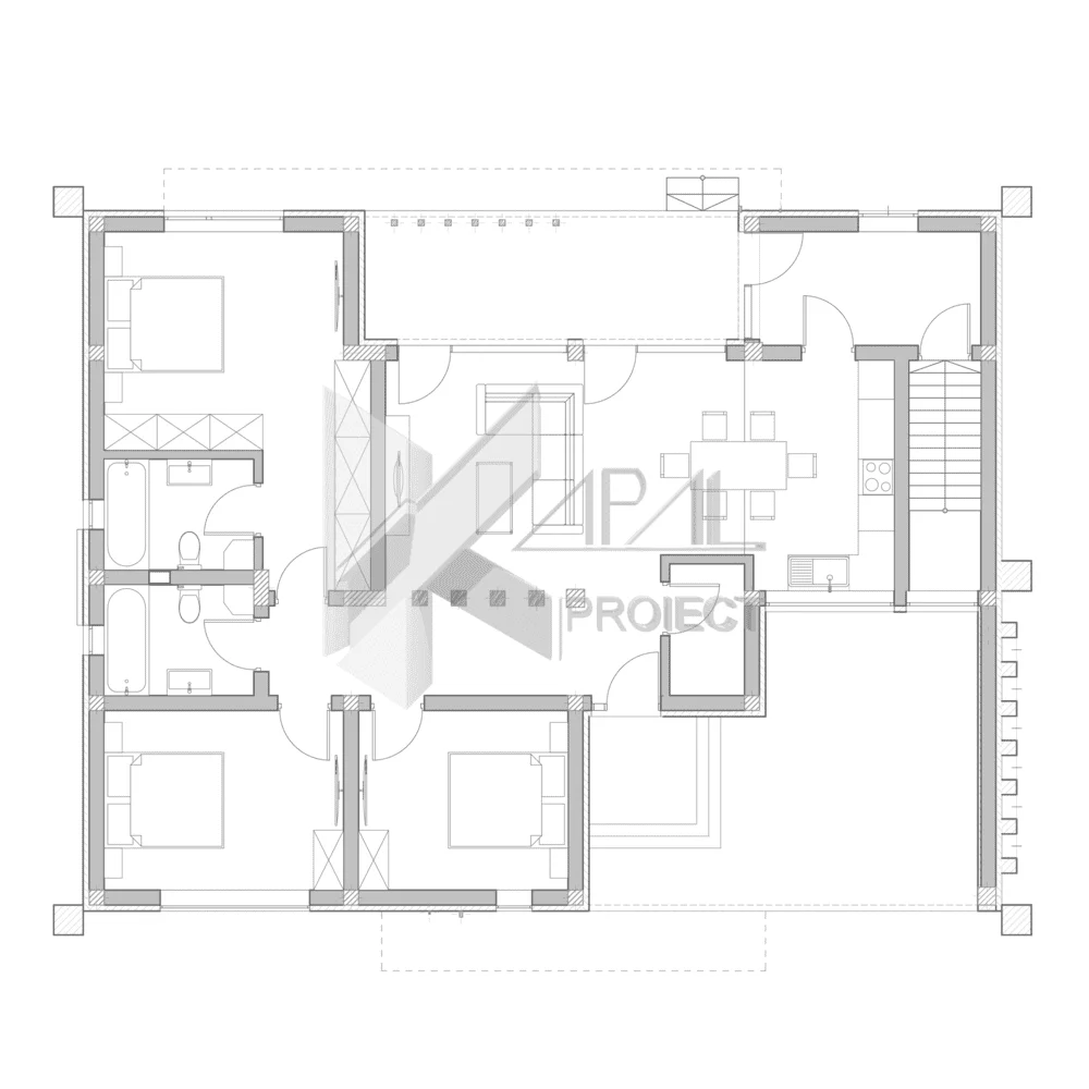 Locuinta propusa este o casa moderna individuala, dezvoltata pe subsol si parter, cu o arhitectura contemporana si un aspect distinctiv. Volumetria este pusa in valoare de acoperisul desfasurat pe inaltimi diferite, de ferestrele generoase si de jocul de materiale utilizate pe fatade. Parterul adaposteste zona de zi si zona de noapte, organizate functional, cu spatii bine proportionate si o relatie directa cu terasa acoperita. Subsolul este destinat spatiilor tehnice, contribuind la o utilizare eficienta a cladirii. Imaginea exterioara este definita de combinatia dintre tencuiala fina in nuante de alb si gri, caramida si panourile tip TRESPA de culoare maro, care confera dinamism si echilibru ansamblului. Acoperisul de tip sarpanta completeaza caracterul modern al locuintei.