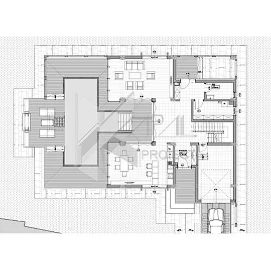 Parterul găzduiește zona de zi și funcțiunile auxiliare, organizate în jurul unui hol central generos, care asigură distribuția către windfang, baie, cameră tehnică, living, bucătărie, garaj și nodul vertical de circulație. Zona de zi se deschide către o terasă amplă, parțial încadrată de arcade, ce integrează o piscină poziționată central în formă de T, devenind punctul focal al întregii locuințe.