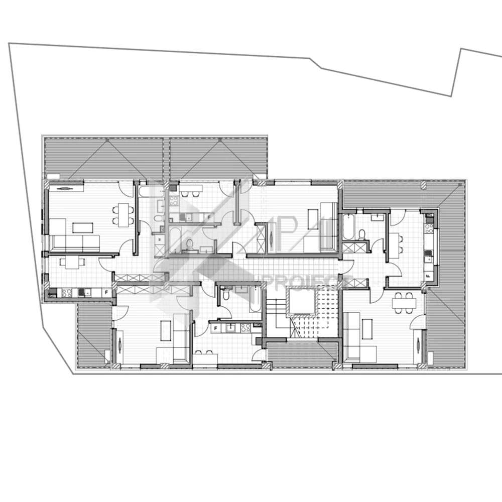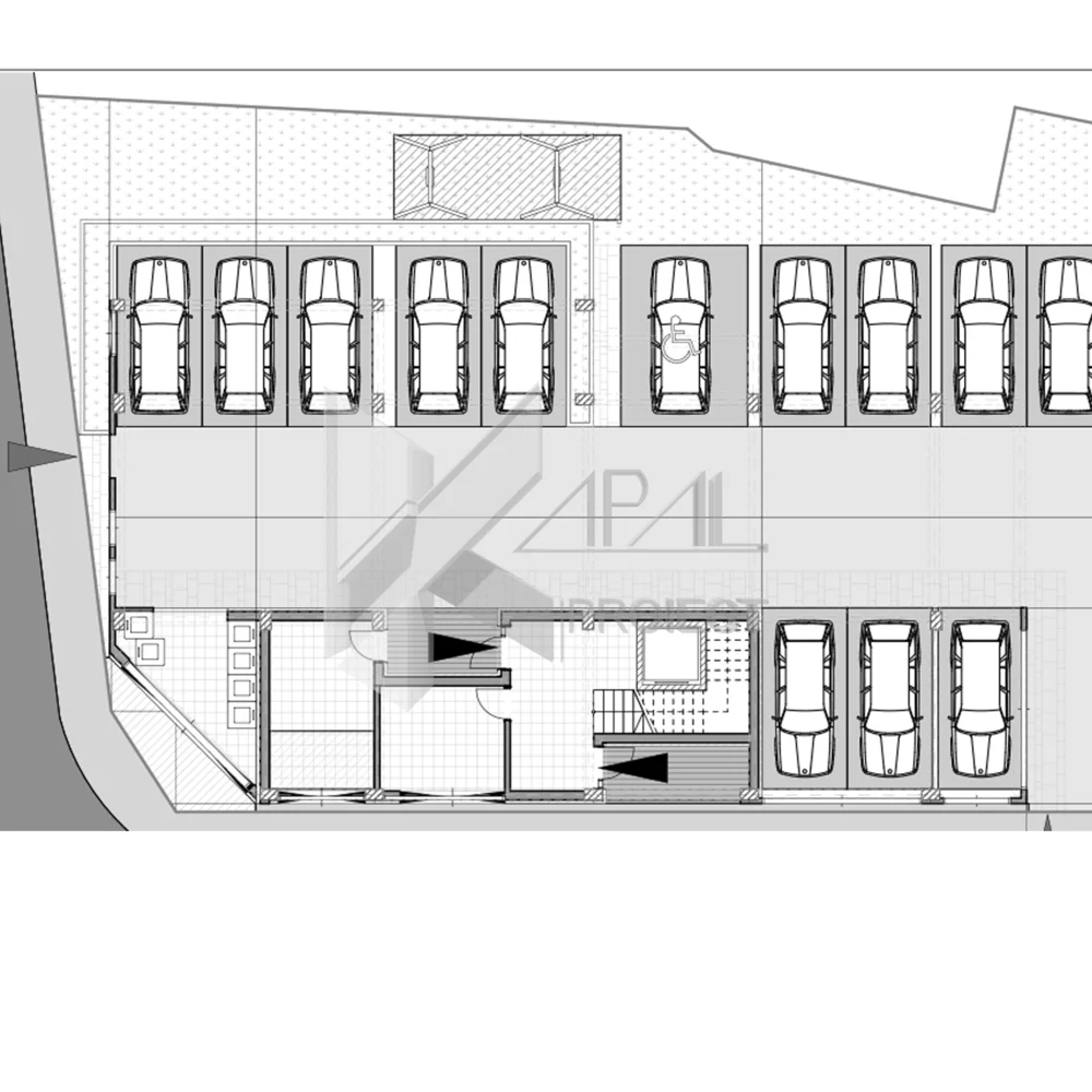 Parterul este tratat ca bază funcțională a clădirii, fiind eliberat de funcțiuni de locuire și destinat în principal parcării, spațiilor tehnice și zonelor de depozitare, ceea ce permite o bună separare între zona publică și cea rezidențială. Incinta este delimitată către stradă printr-un sistem de grilaje metalice, care sugerează caracterul tehnic al bazei și asigură totodată intimitate.