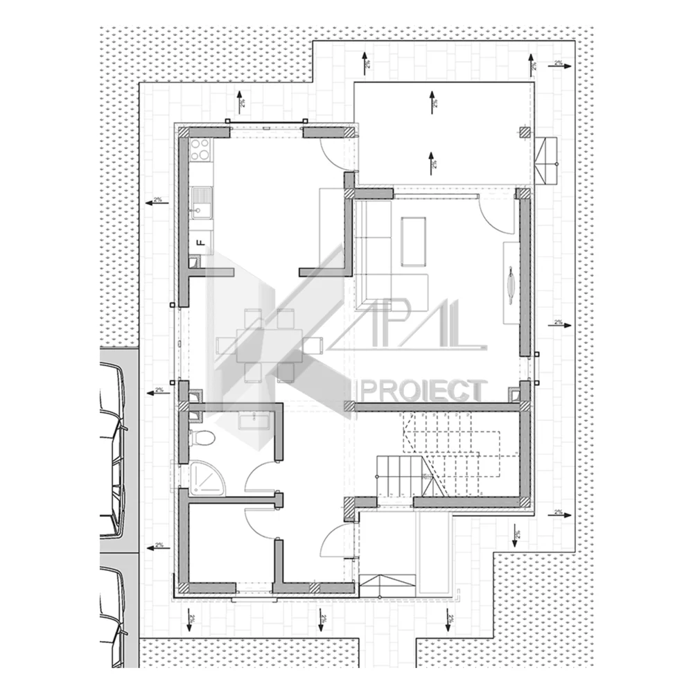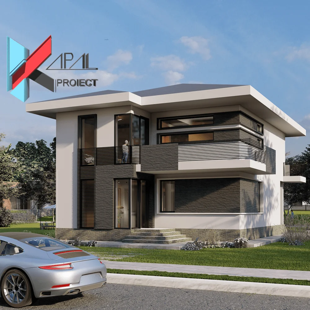 Materialele propuse îmbină eleganța și durabilitatea: tencuială decorativă albă, piatră decorativă gri (nuanțe deschis/închis), tâmplărie PVC gri închis și balustrade metalice. Acoperișul tip șarpantă cu țiglă metalică completează imaginea contemporană și asigură protecție pe termen lung. Cu amprenta la sol de 86,56 mp și perimetrul etajului superior de 93,05 mp, K048 optimizează parcela, oferind în același timp 26,28 mp de balcoane și o terasă perfect integrată.
