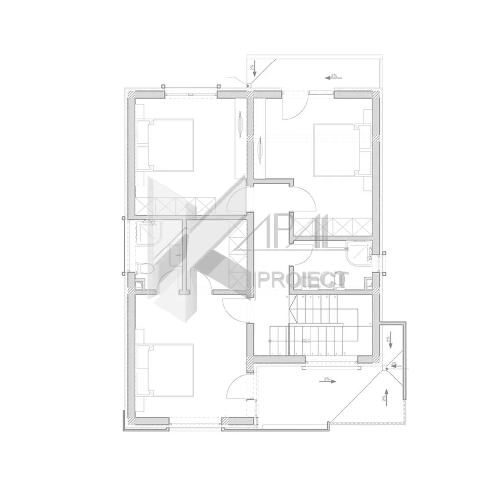 La etaj, zona de noapte oferă intimitate și ordine: trei dormitoare bine dimensionate, două băi și un dressing dedicat dormitorului matrimonial. Două balcoane amplifică lumina naturală și ventilația, în timp ce nodul vertical asigură un flux de circulație firesc și sigur pentru copii.