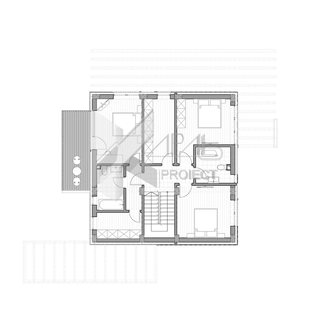 La interior, planimetria separă clar zona de zi la parter de zona de noapte la etaj. Livingul cu dining comunică fluid cu două terase – una acoperită (9,83 mp) pentru utilizare în toate sezoanele și una neacoperită (38,30 mp) pentru lounge și dining în aer liber. La etaj, dormitorul matrimonial beneficiază de baie proprie, dressing și balcon, în timp ce alte două dormitoare împart o baie completă și au la dispoziție un dressing separat. Spațiul tehnic de la parter și zonele de depozitare asigură o exploatare simplă și ordonată a casei.