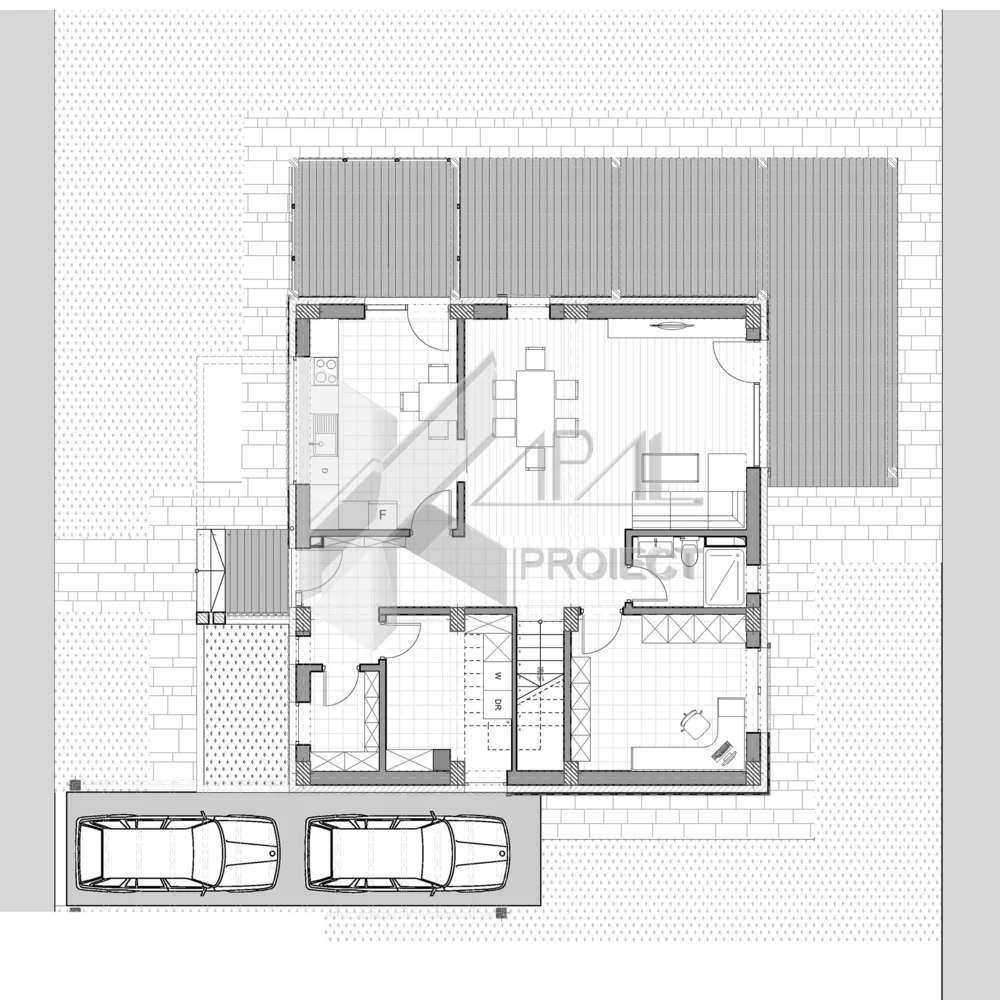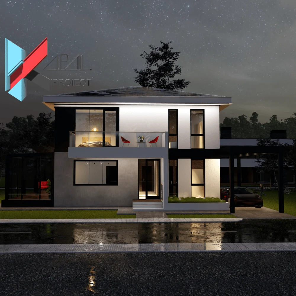 Acest proiect propune o locuință modernă P+1E, compactă și perfect echilibrată între confort, estetică și funcționalitate. Volumetria clară este dinamizată de pergolele metalice dispuse pe trei laturi, care extind zona de zi spre exterior, creează umbrire controlată și protejează accesul dinspre locurile de parcare.