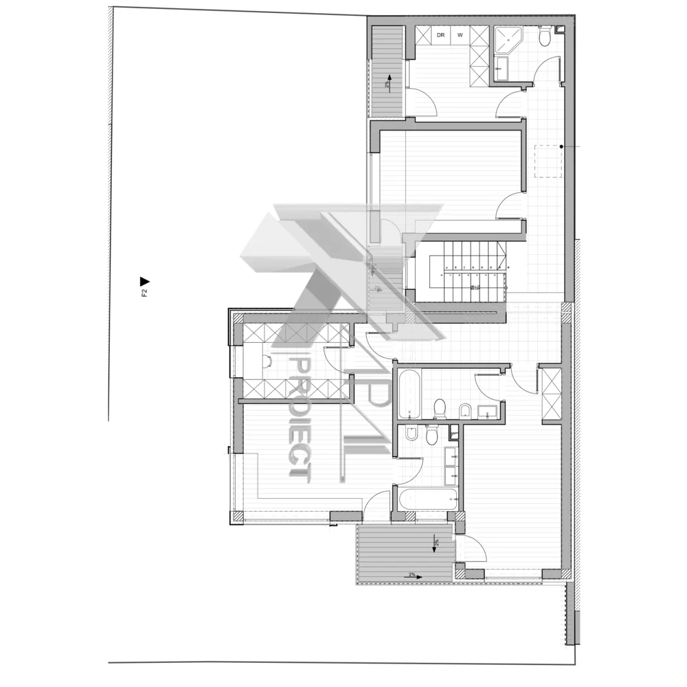 La etaj, compartimentarea oferă intimitate ridicată: un dormitor matrimonial cu dressing și baie proprie, un dormitor secundar, un dormitor pentru oaspeți și o spălătorie separată. Balcoanele facilitează ventilarea naturală și extinderea spațiului de sejur în aer liber, două dintre dormitoarele sudice fiind conectate printr-un balcon comun.