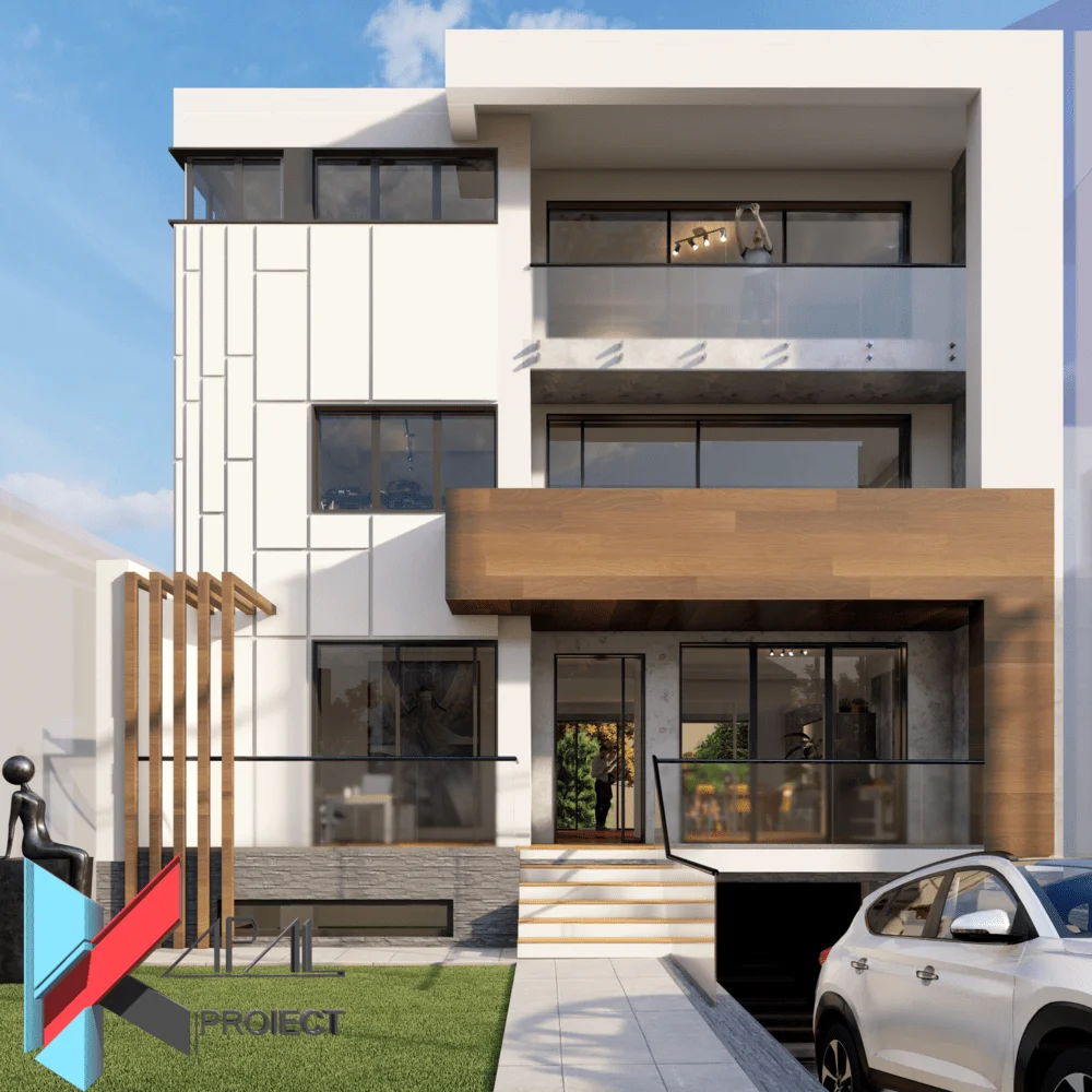 La exterior, compoziția volumetrică sparge monotonia frontului stradal prin glisări de volume și încadrări asimetrice ale balcoanelor. Textura materialelor urmărește un contrast subtil: placaje tip Trespa în finisaj alb și mahoniu, piatră decorativă gri și tencuială alb/gri. Parapetul plin la balconul de la etajul 1 oferă masivitate și control vizual, în timp ce la etajul 2 parapetul din sticlă securizată, laminată aduce transparență și ușurință. Pe fațada secundară (spre curte) predomină suprafețele vitrate mari, crescând intimitatea în grădina din spate și captând lumină pe adâncimea planului. Pergolele din lemn accentuează terasele și filtrează soarele, iar riflajele temperează aportul solar și compun o identitate caldă, contemporană.