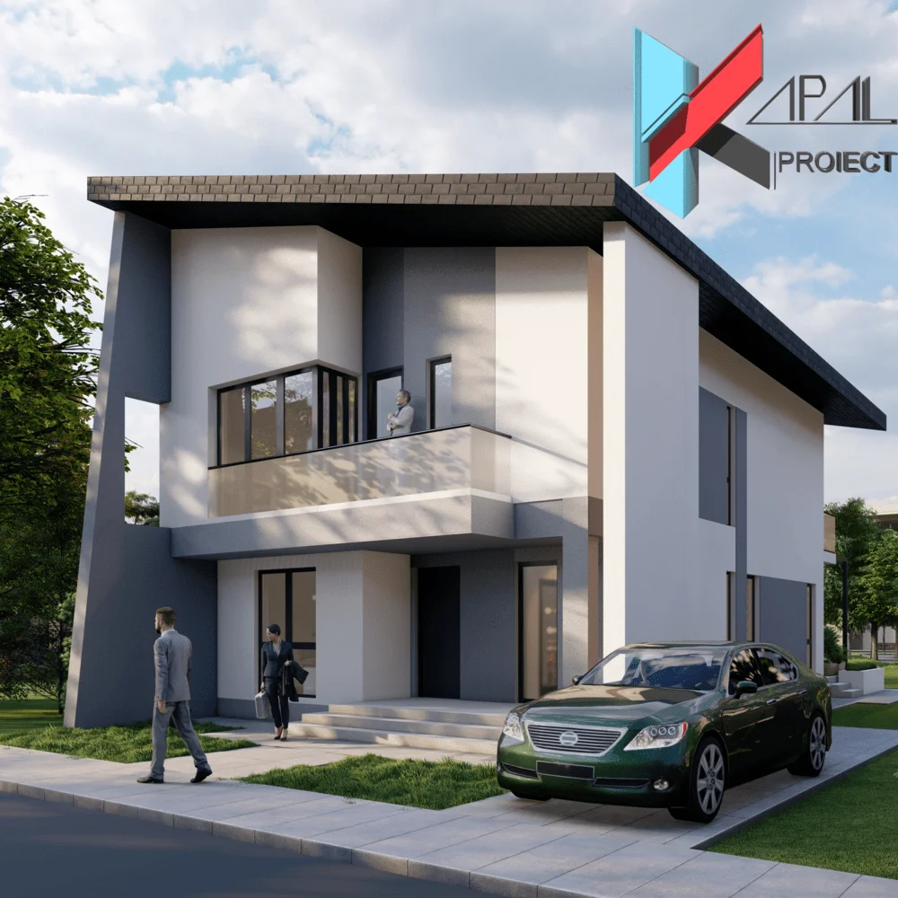 Volumul minimalist îmbină tencuieli alb și gri, iar fațada principală este accentuată de doi pereți decorativi care conturează un acoperiș într-o apă. În zona de grădină, terasa de 24,00 mp este protejată de o pergolă metalică și flancată de jardiniere, creând un spațiu exterior ideal pentru relaxare și dining.