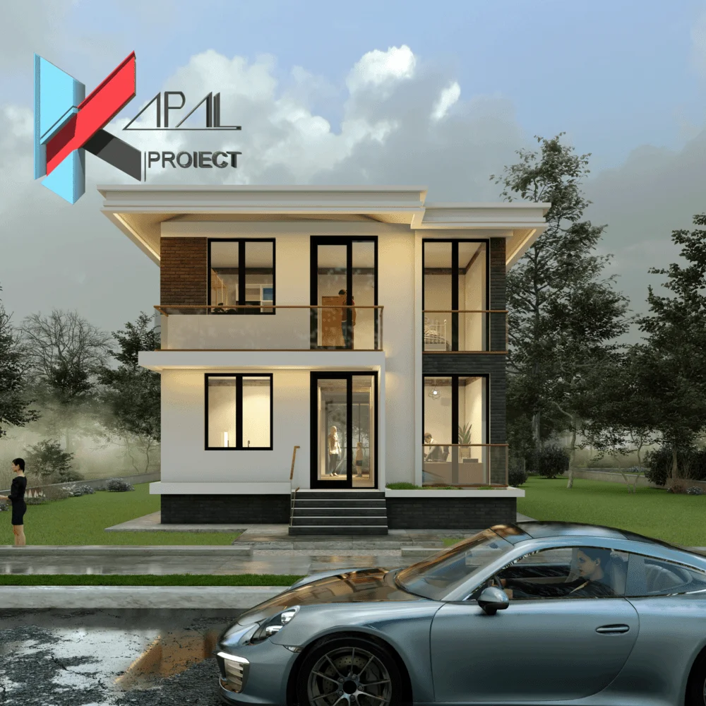 Imaginea arhitecturală este definită de tencuiala decorativă albă, accentele de piatră decorativă gri pe colțuri și soclu, tâmplăria PVC antracit și balustradele din sticlă, rezultând un aspect contemporan și echilibrat.