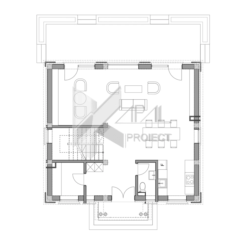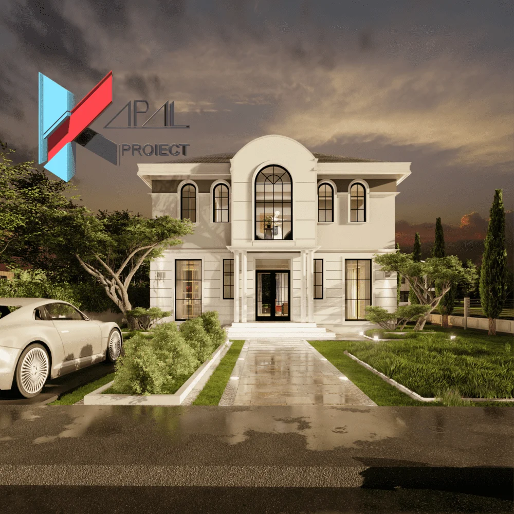 Proiectul propune o locuință individuală compactă și elegantă, cu arhitectură clasică atent proporționată. Fațada valorifică profilele decorative pentru delimitarea registrelor, cornișa marcată, rame pentru ferestre și jardiniere, în timp ce riflajele tencuite pe parter conferă volumetriei ritm și robustețe. Colțurile clădirii sunt accentuate discret, iar tâmplăria în nuanțe închise pune în valoare golurile ample fără a perturba compoziția.