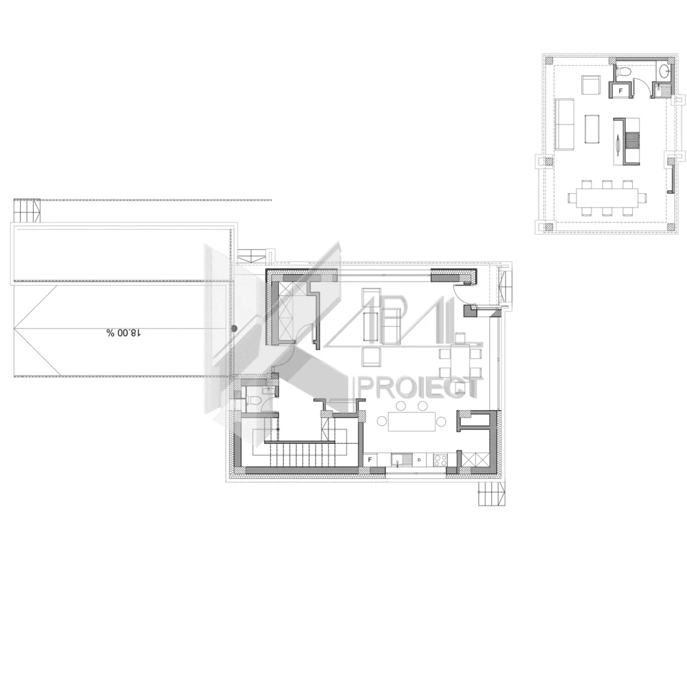 Subsolul devine un atu major al casei: garajul (34,85 mp) și multiplele spații de depozitare susțin un stil de viață ordonat, păstrând parterul aerisit. Acoperișul tip terasă necirculabilă conferă o linie contemporană clară și permite un detaliu de cornișă curat.