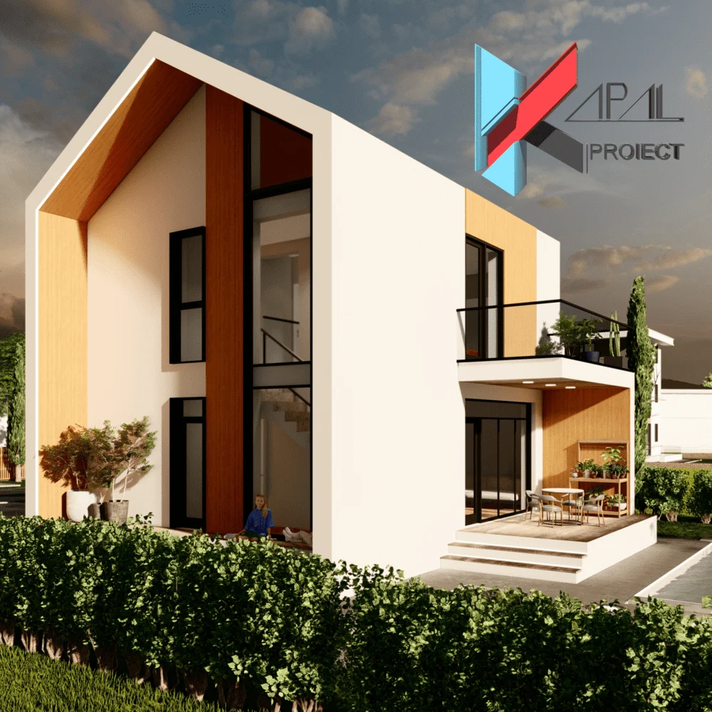 Proiectul K091 propune o casă modernă, P+1E, gândită ca refugiu confortabil pentru vacanțe sau ca locuință permanentă cu amprentă redusă și costuri de exploatare optimizate. Volumetria clară, acoperișul în două ape cu jgheab ascuns și terasele/balcoanele dispuse pe trei laturi oferă o imagine contemporană, dar prietenoasă cu contextul natural.