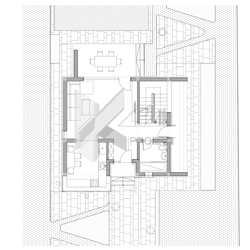 La parter, zona de zi este amplă și luminoasă, cu living conectat la terasa din spate și bucătărie bine proporționată pentru uz zilnic sau seri cu prietenii. Nodul vertical este eficient integrat și include spațiu tehnic sub scară, maximizând funcționalitatea fără a consuma suprafață utilă. Dubla accesibilitate (dinspre stradă și curtea laterală) crește flexibilitatea în utilizare și organizarea curții.