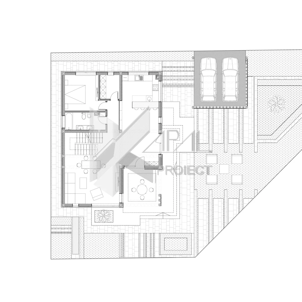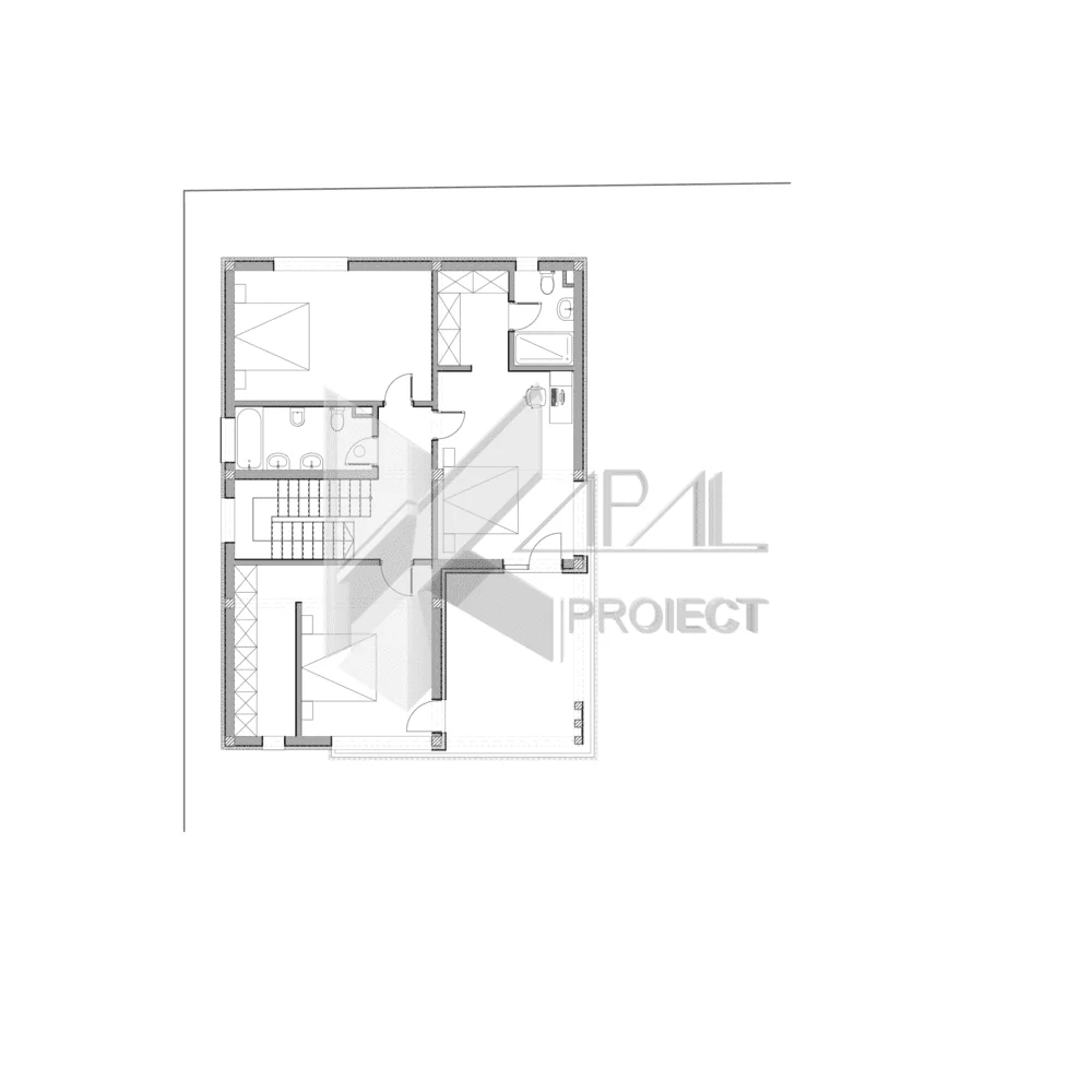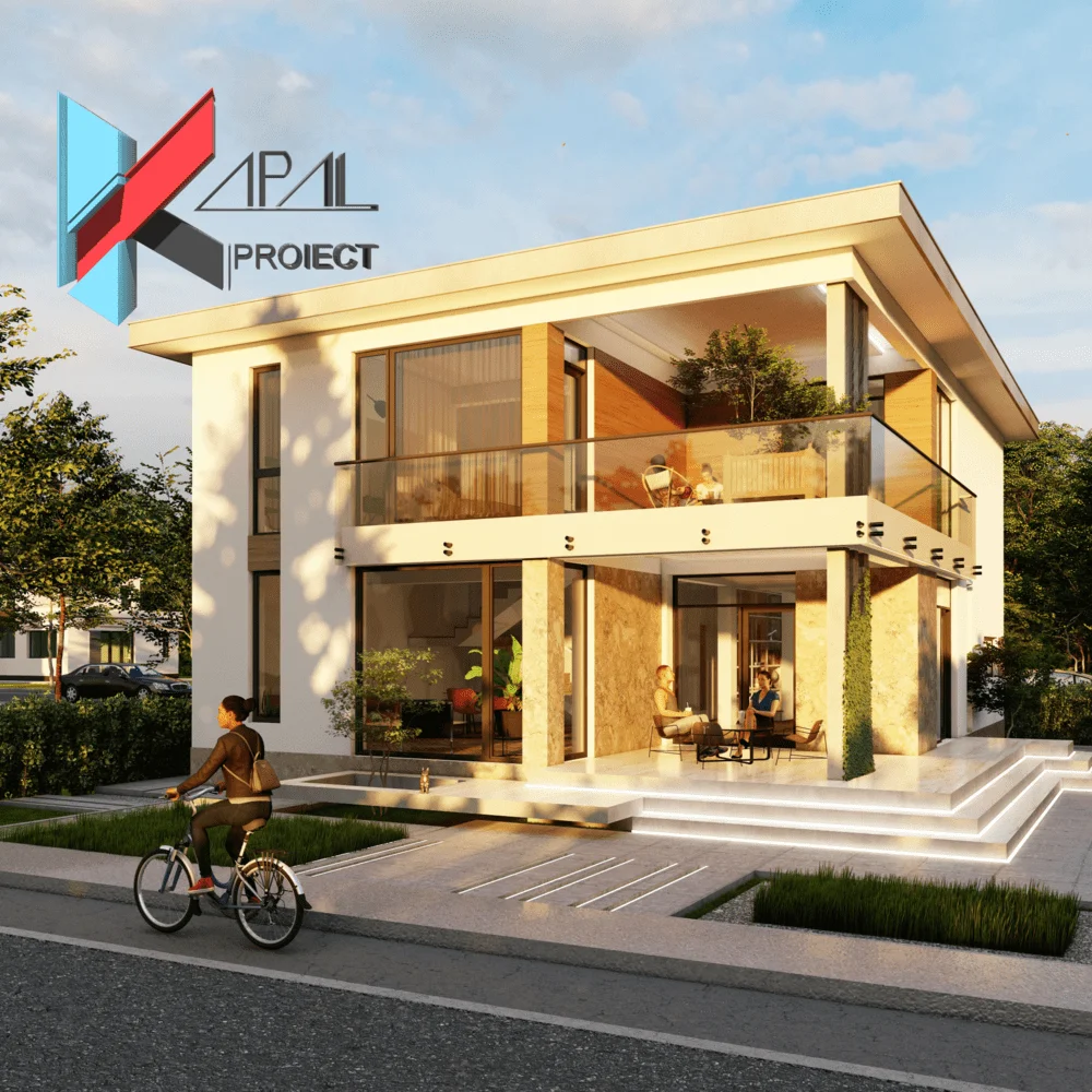 Această locuință modernă este concepută pentru o familie cu doi sau trei copii, având regim de înălțime Parter + Etaj 1 și o organizare funcțională clară. Volumetria echilibrată și forma în plan a clădirii generează spații exterioare generoase, respectiv o terasă amplă la parter și un balcon spațios la etaj.