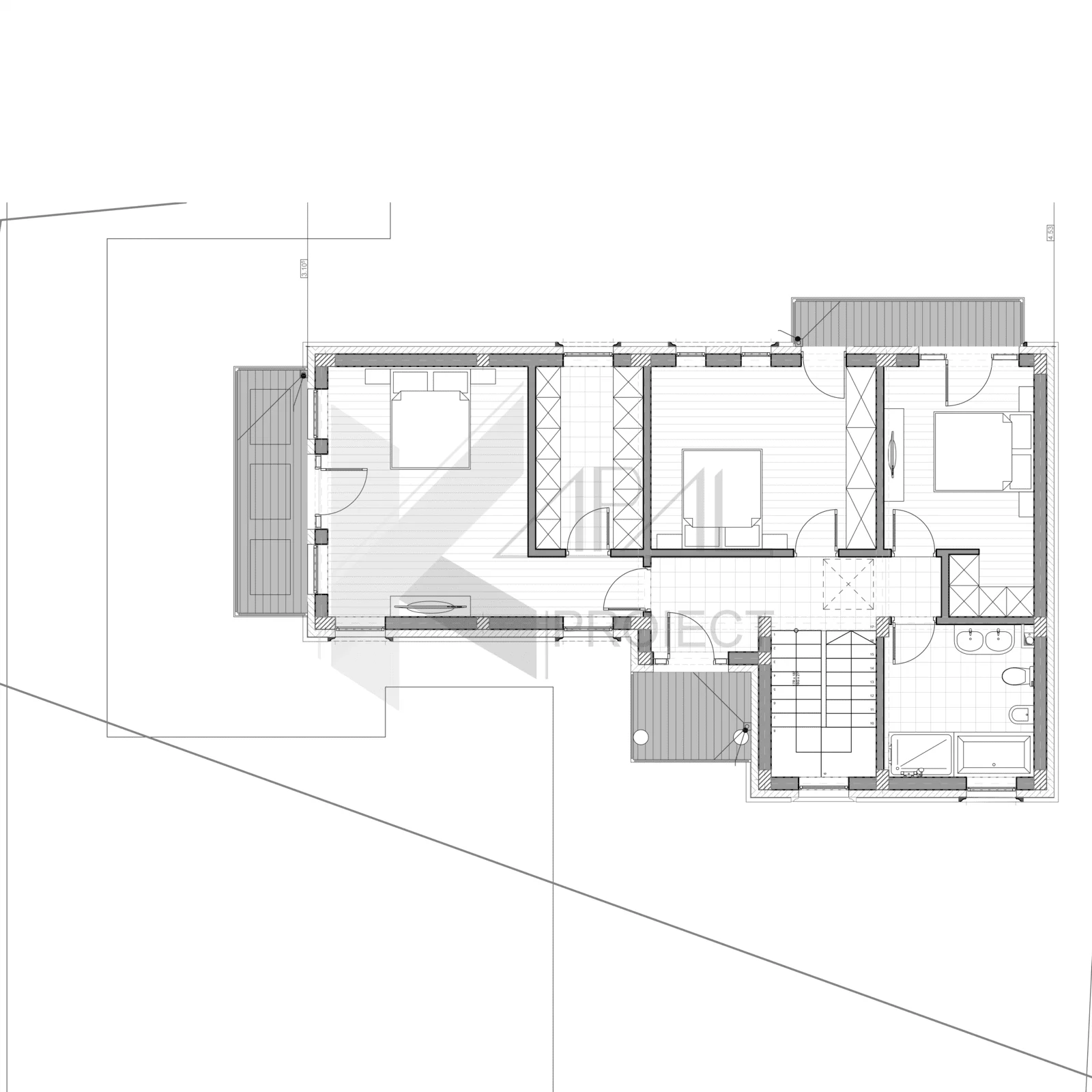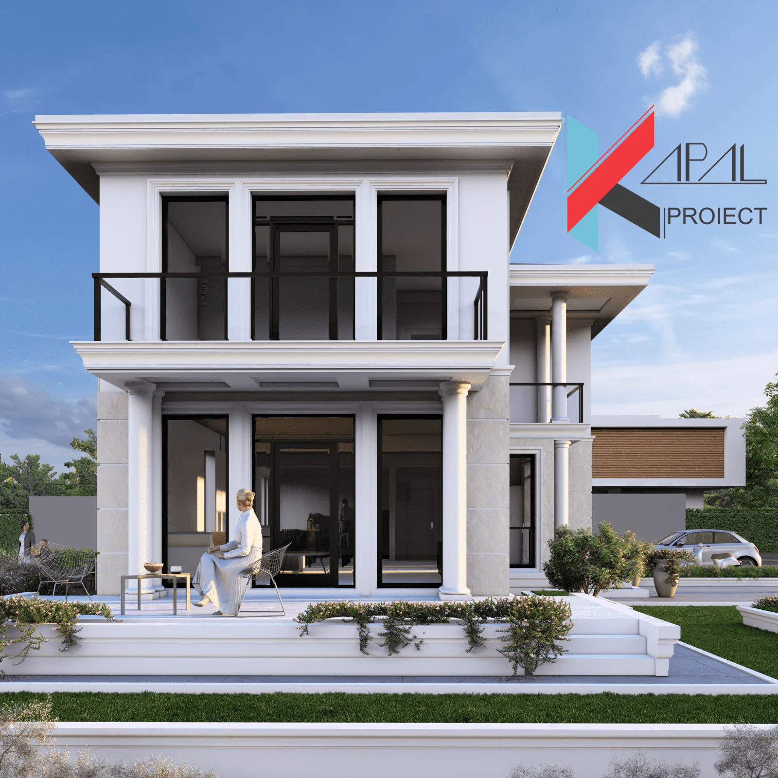 Această locuință individuală este concepută într-un limbaj arhitectural clasic, având regim de înălțime Parter + Etaj 1 și o compoziție echilibrată, care îmbină caracterul impunător cu eleganța detaliilor. Volumetria este compactă și bine proporționată, iar fațadele sunt articulate prin ancadramente delicate și goluri vitrate generoase, care permit luminii naturale să pătrundă în profunzimea spațiilor.