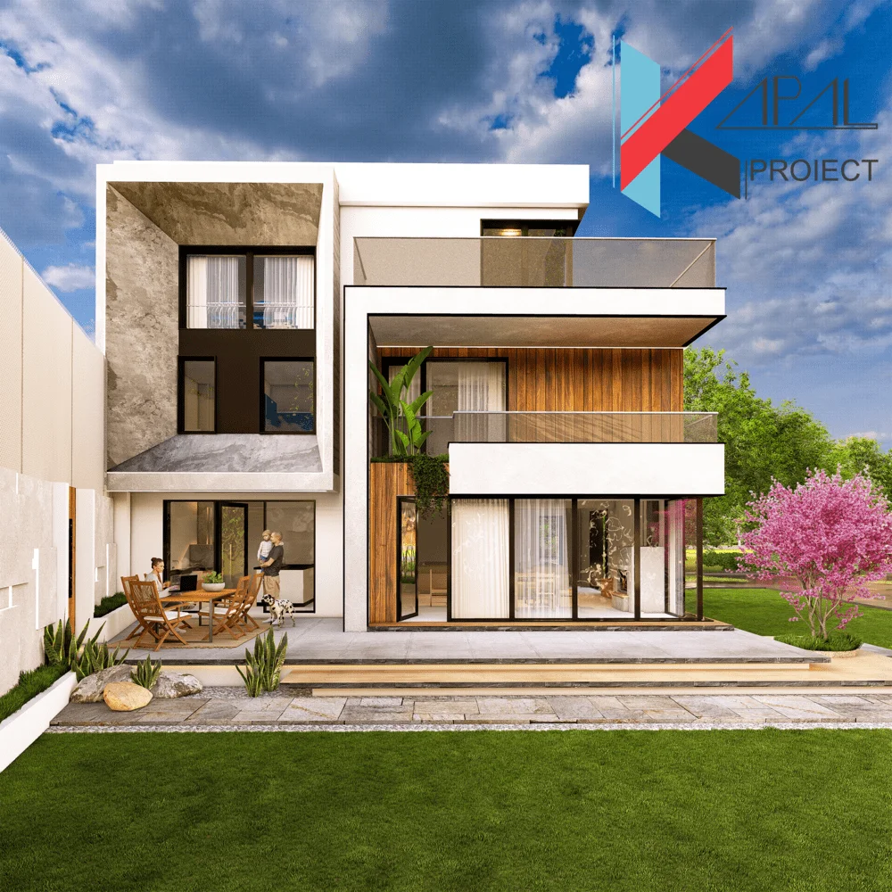 Această casă modernă este concepută ca o locuință urbană cu regim de înălțime Parter + 2 Etaje, având o volumetrie clară, proporții echilibrate și o organizare funcțională care permite integrarea unei funcțiuni comerciale la nivelul parterului, fără a afecta intimitatea zonei rezidențiale. Clădirea se remarcă printr-o arhitectură contemporană, cu fațade articulate prin retrageri, logii și balcoane generoase.