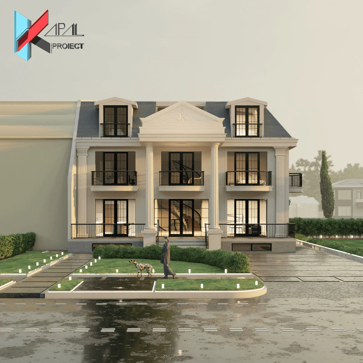 Fațada este marcată de două coloane centrale, cornișe și ancadramente clasice, însoțite de balcoane generoase și o terasă circulabilă la mansardă. Materialele propuse — tencuială fină albă, soclu din piatră bej, tâmplărie gri antracit și balustrade din fier forjat — consolidează caracterul clasic și rezistența în timp.