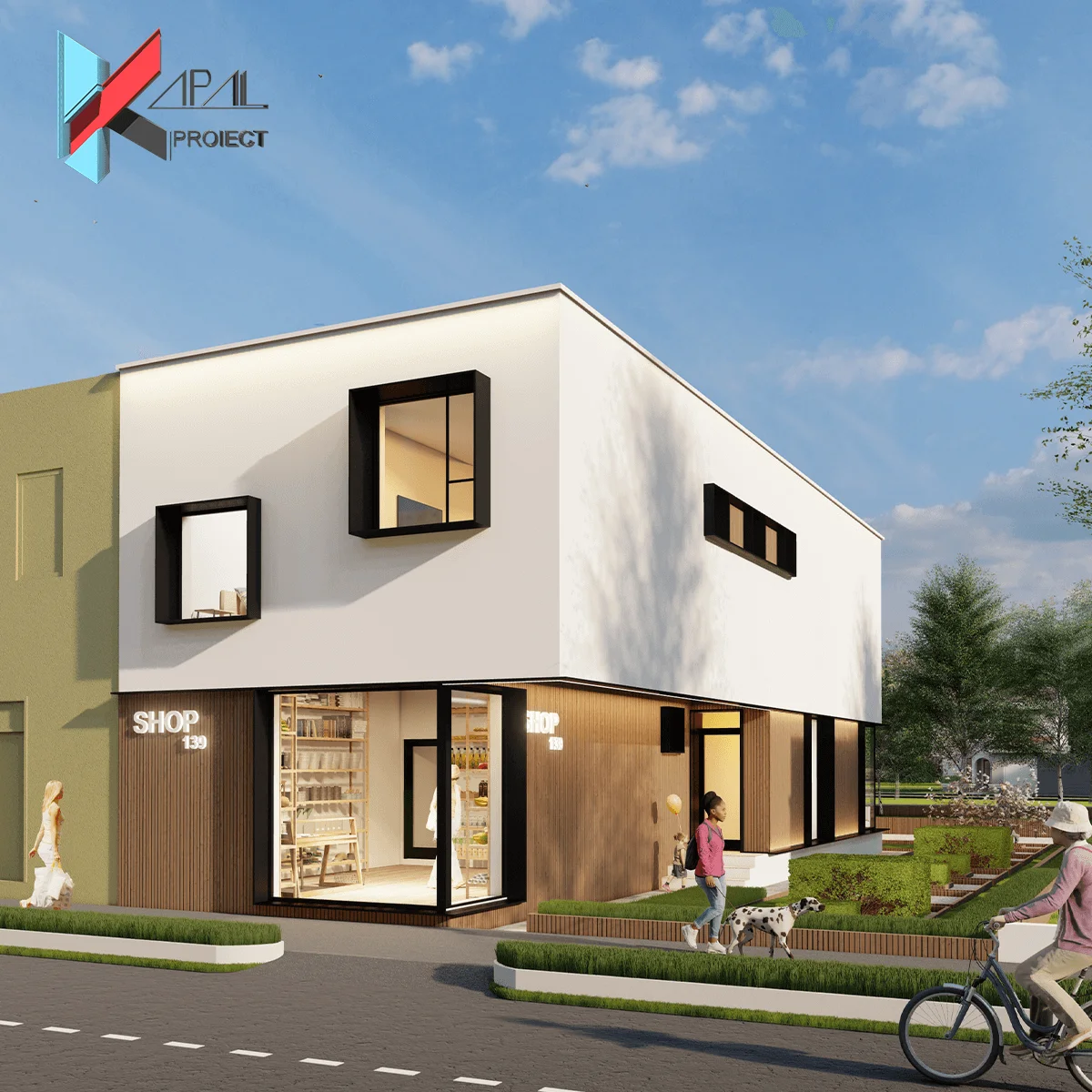 Locuinta individuala moderna, cu regim de inaltime parter si etaj, este conceputa ca o cladire cuplata ce integreaza la nivelul strazii un spatiu comercial, oferind o solutie eficienta pentru combinarea functiunii de locuire cu cea economica. Proiectul raspunde nevoilor unui stil de viata contemporan, in care locuinta si activitatea profesionala pot coexista in acelasi ansamblu construit.