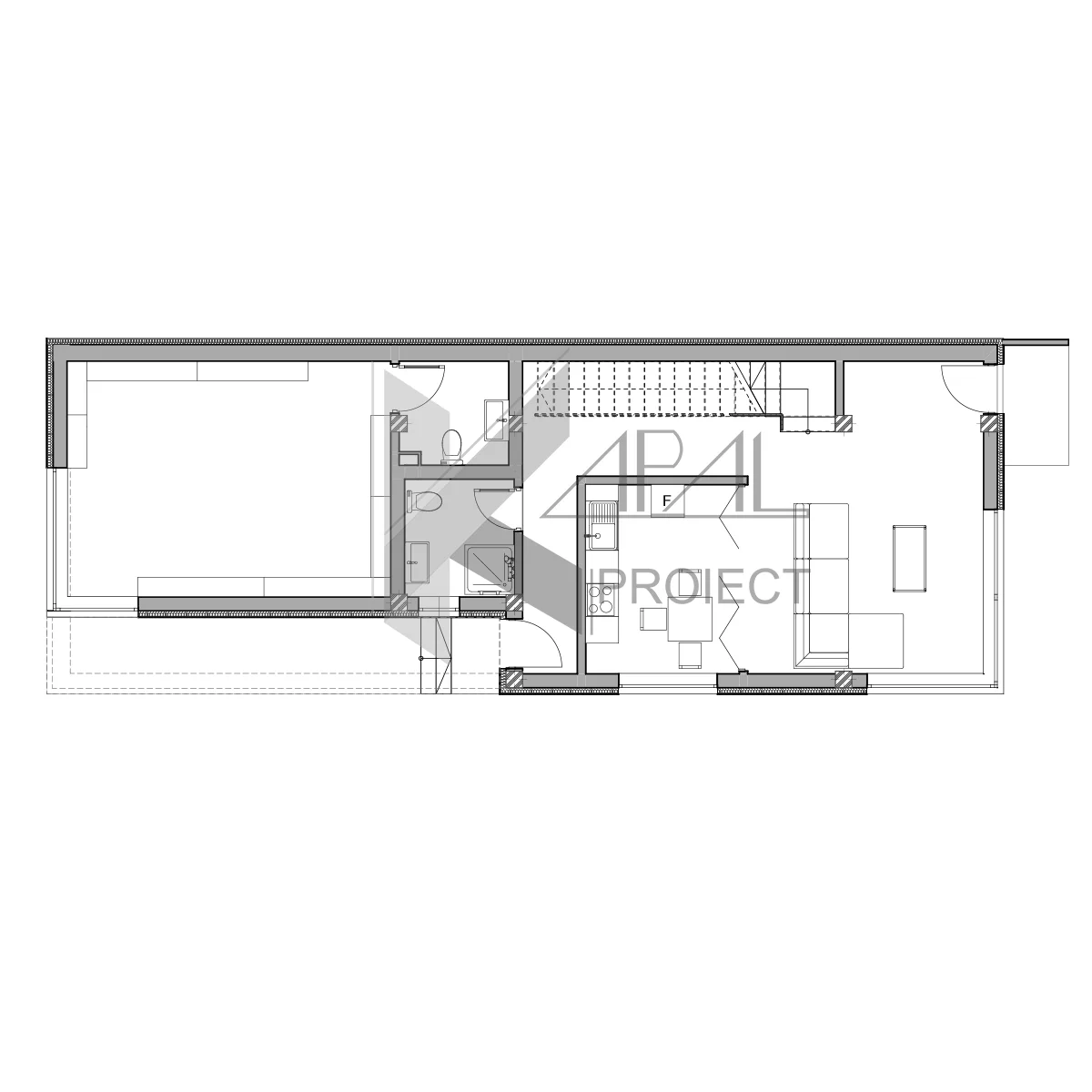 La parter, cladirea este organizata astfel incat spatiul comercial de 25.16 mp, insotit de un grup sanitar propriu, beneficiaza de acces direct din strada, functionand independent fata de zona rezidentiala. Locuinta este accesata separat si include un hol de distributie, o baie, bucataria de 9.54 mp si zona de living cu loc de luat masa de 22.38 mp, configurate ca un spatiu de zi luminos si functional. Nivelul este completat de nodul vertical de circulatie care face legatura cu etajul.