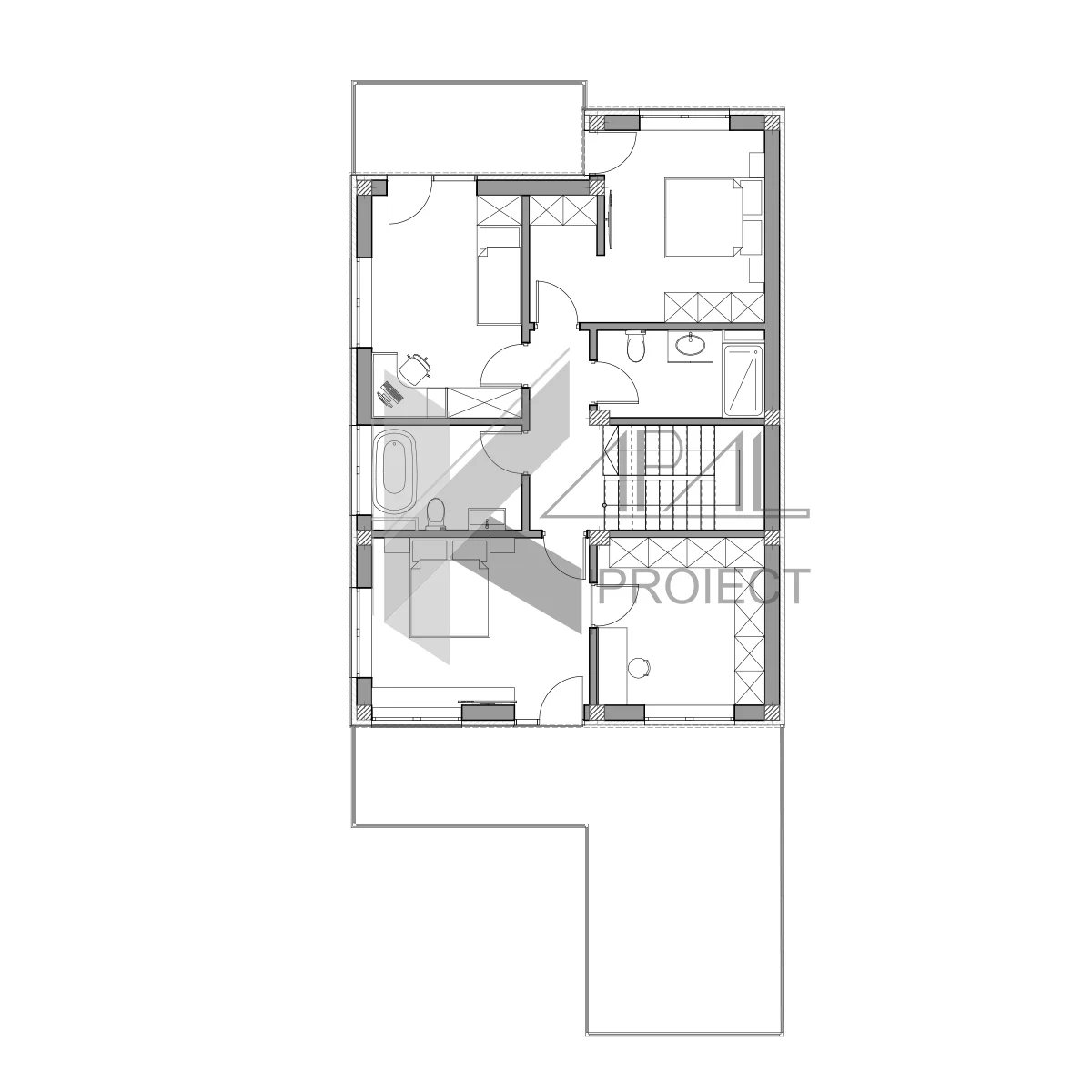 La etaj, zona de noapte oferă 3 dormitoare bine proporționate. Dormitorul matrimonial se remarcă prin dressingul dedicat (11,18 mp) și accesul către o terasă amplă (33,32 mp), veritabilă cameră exterioară. Încă două dormitoare deservite de două băi asigură confortul familiei, în timp ce balconul (8,37 mp) și golurile vitrate mari aduc lumină naturală din abundență pe tot parcursul zilei.