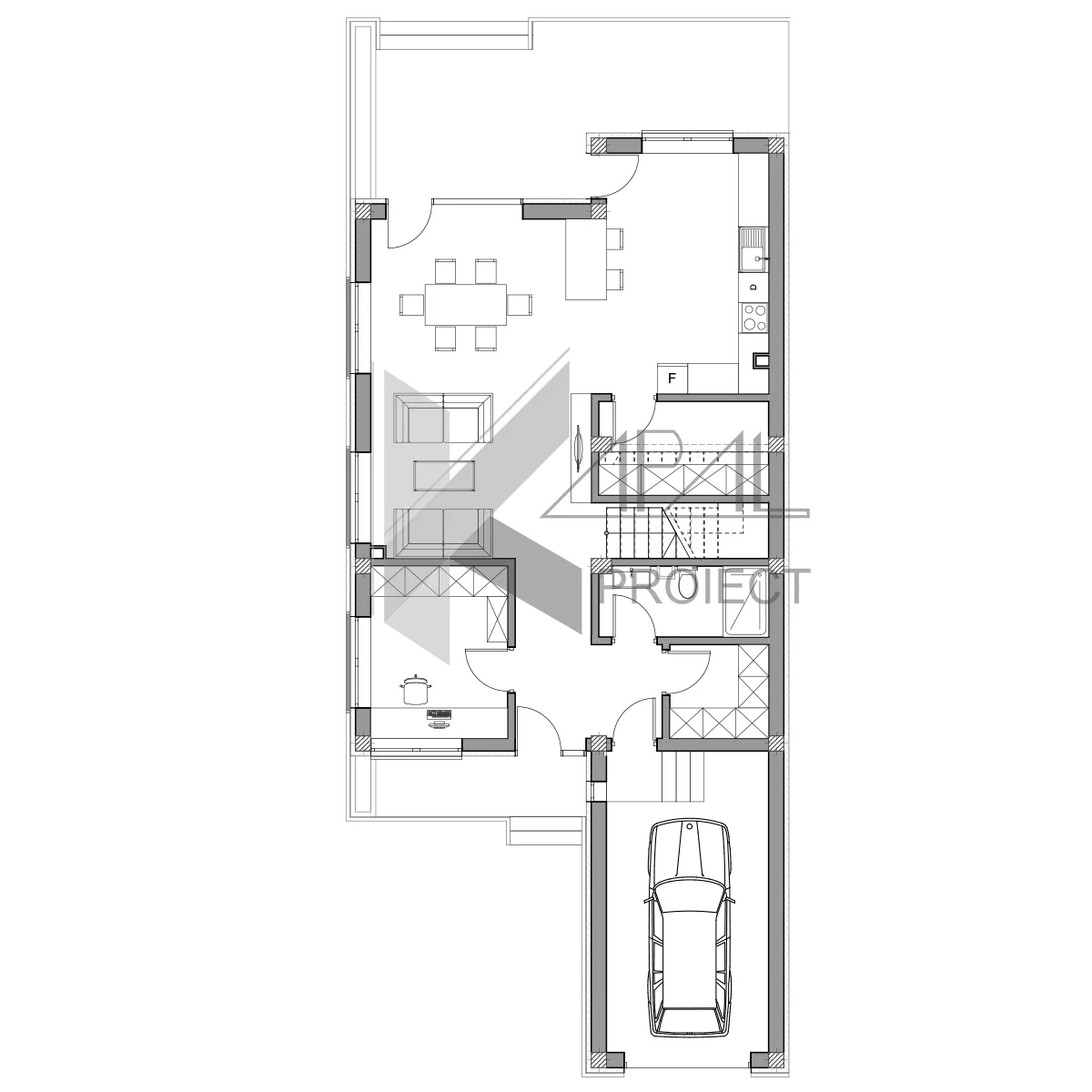 Planul funcțional este conceput pentru viața de zi cu zi: la parter, zona de zi este fluidă, cu living + loc de luat masa (29,07 mp) și bucătărie separată (15,67 mp) conectată la o depozitare (6,12 mp), utile pentru organizare. Un birou (9,18 mp) susține lucrul de acasă, iar grupul sanitar (4,56 mp) deservește vizitatorii. Garajul (17,12 mp) asigură confort la parcare și acces direct. O terasă generoasă (21,51 mp) extinde experiența diurnă spre exterior.