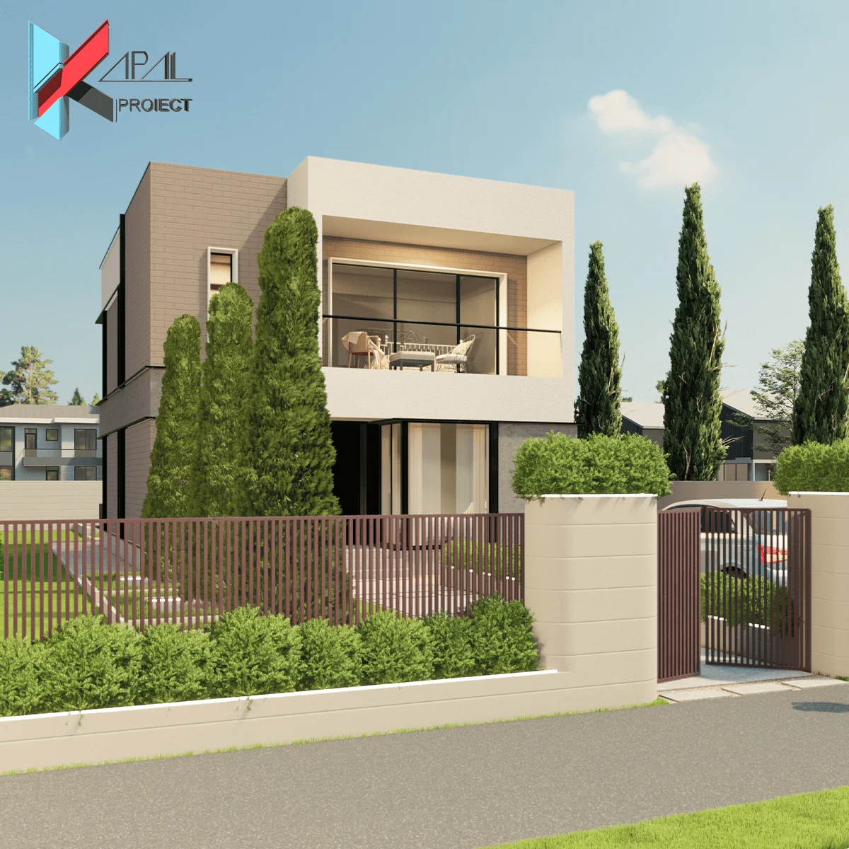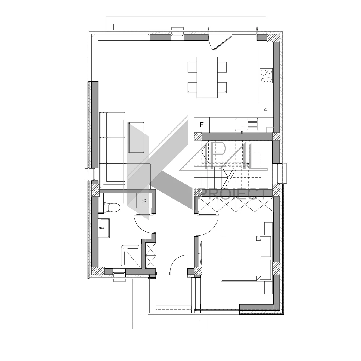 O casă modernă P+1E concepută ca monovolum cu goluri vitrate generoase până în pardoseală, ce pun în valoare lumina naturală și relația cu exteriorul. Cu 107.64 mp utili și o amprentă la sol de 77.56 mp, locuința optimizează fiecare metru pătrat, oferind o compartimentare clară între zona de zi la parter și zona de noapte la etaj.