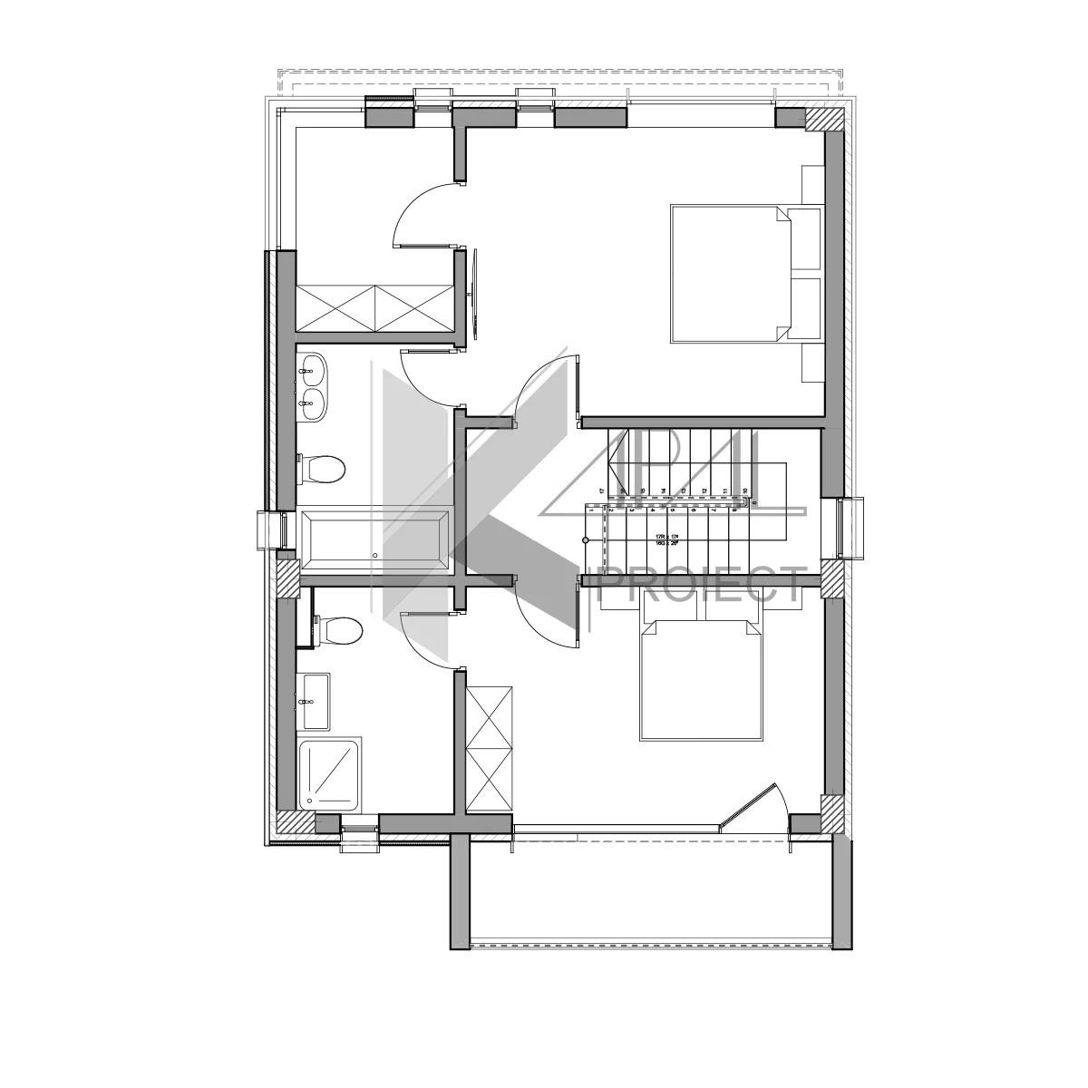 Planul răspunde nevoilor unei familii moderne: living + bucătărie + loc de luat masa (32.81 mp) într-un open-space fluid, 3 dormitoare și 3 băi, plus spații de depozitare și circulații compacte. La etaj, masterul beneficiază de dressing dedicat și baie proprie, iar al doilea dormitor are baie proprie și acces la balconul de 7.38 mp. Dimensiunile controlate — 11.05 × 7.55 m — fac proiectul potrivit pentru loturi urbane medii, păstrând totodată o prezență arhitecturală puternică.