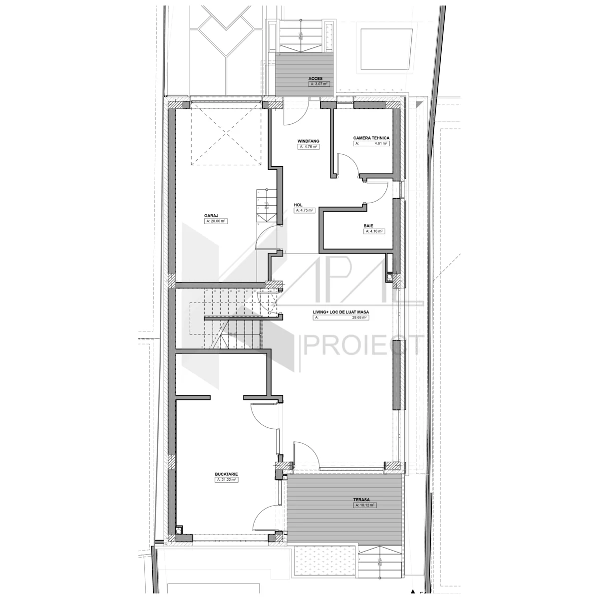 Funcțional, casa este gândită pentru o familie modernă: zona de zi de la parter comunică fluent cu terasa și grădina, iar zona de noapte de la etaj asigură intimitate, depozitare generoasă și băi bine poziționate. Garajul integrat și camera tehnică optimizează fluxurile zilnice, de la parcare la mentenanța echipamentelor.