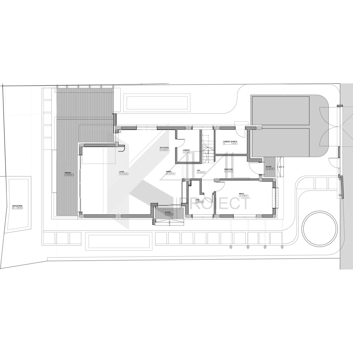 La parter, fluxul se desfășoară natural din windfang spre zona de zi: livingul de 31,43 mp se deschide către o terasă din lemn de 24,43 mp, cu pergolă albă și loc dedicat pentru lounge + dining exterior. Bucătăria (14,83 mp) cu dining (10,77 mp) este completată de cămară generoasă, iar biroul de 14,84 mp permite lucrul în liniște, separat de zona de zi. Camera tehnică și baia parter eficientizează funcționarea locuinței.